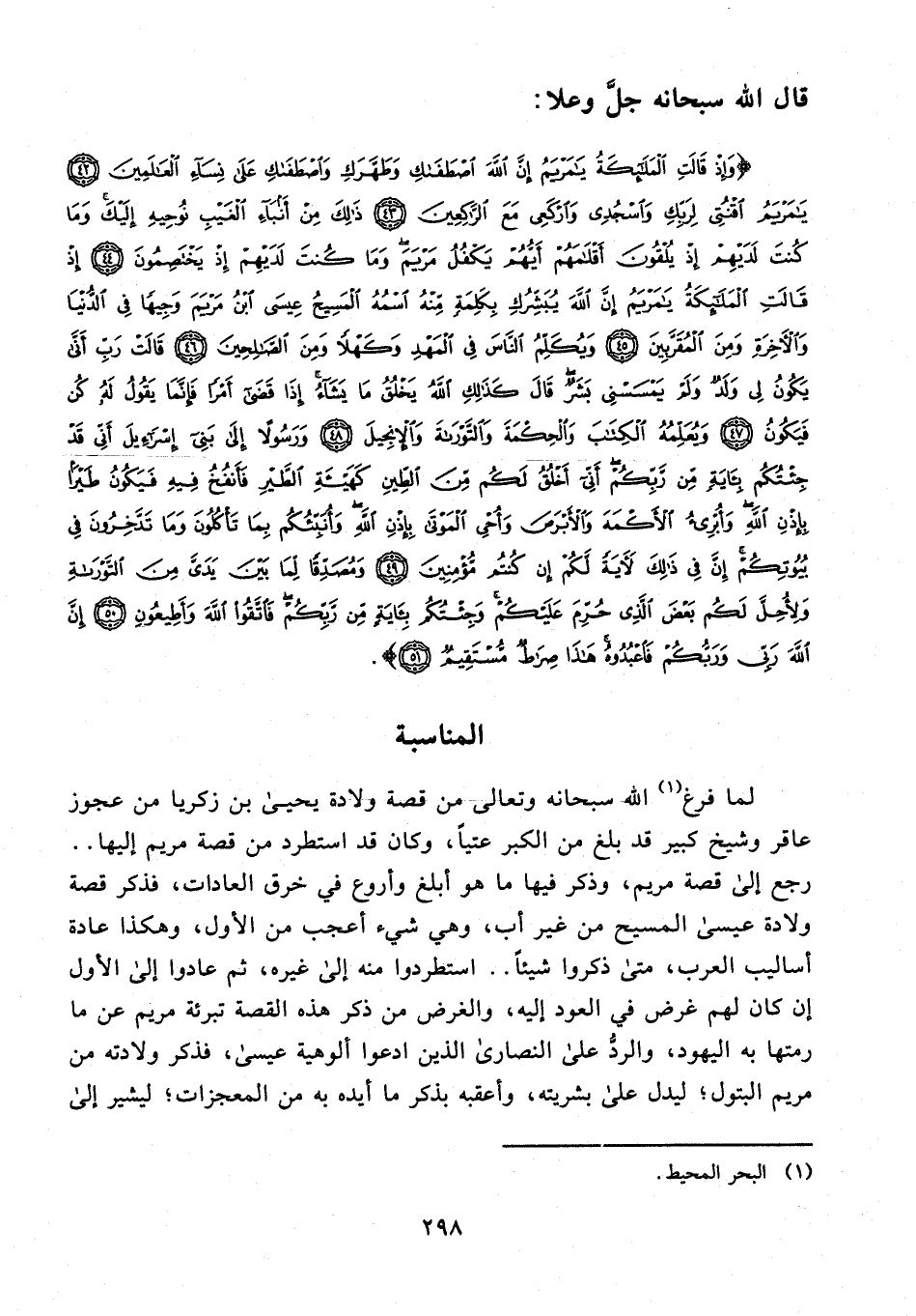 {وَإِذْ قَالَتِ الْمَلَائِكَةُ يَا مَرْيَمُ إِنَّ اللَّهَ اصْطَفَاكِ وَطَهَّرَكِ وَاصْطَفَاكِ عَلَى نِسَاءِ الْعَالَمِينَ (42) يَا مَرْيَمُ اقْنُتِي لِرَبِّكِ وَاسْجُدِي وَارْكَعِي مَعَ الرَّاكِعِينَ (43) ذَلِكَ مِنْ أَنْبَاءِ الْغَيْبِ نُوحِيهِ إِلَيْكَ وَمَا كُنْتَ لَدَيْهِمْ إِذْ يُلْقُونَ أَقْلَامَهُمْ أَيُّهُمْ يَكْفُلُ مَرْيَمَ وَمَا كُنْتَ لَدَيْهِمْ إِذْ يَخْتَصِمُونَ (44) إِذْ قَالَتِ الْمَلَائِكَةُ يَا مَرْيَمُ إِنَّ اللَّهَ يُبَشِّرُكِ بِكَلِمَةٍ مِنْهُ اسْمُهُ الْمَسِيحُ عِيسَى ابْنُ مَرْيَمَ وَجِيهًا فِي الدُّنْيَا وَالْآخِرَةِ وَمِنَ الْمُقَرَّبِينَ (45) وَيُكَلِّمُ النَّاسَ فِي الْمَهْدِ وَكَهْلًا وَمِنَ الصَّالِحِينَ (46) قَالَتْ رَبِّ أَنَّى يَكُونُ لِي وَلَدٌ وَلَمْ يَمْسَسْنِي بَشَرٌ قَالَ كَذَلِكِ اللَّهُ يَخْلُقُ مَا يَشَاءُ إِذَا قَضَى أَمْرًا فَإِنَّمَا يَقُولُ لَهُ كُنْ فَيَكُونُ (47) وَيُعَلِّمُهُ الْكِتَابَ وَالْحِكْمَةَ وَالتَّوْرَاةَ وَالْإِنْجِيلَ (48) وَرَسُولًا إِلَى بَنِي إِسْرَائِيلَ أَنِّي قَدْ جِئْتُكُمْ بِآيَةٍ مِنْ رَبِّكُمْ أَنِّي أَخْلُقُ لَكُمْ مِنَ الطِّينِ كَهَيْئَةِ الطَّيْرِ فَأَنْفُخُ فِيهِ فَيَكُونُ طَيْرًا بِإِذْنِ اللَّهِ وَأُبْرِئُ الْأَكْمَهَ وَالْأَبْرَصَ وَأُحْيِ الْمَوْتَى بِإِذْنِ اللَّهِ وَأُنَبِّئُكُمْ بِمَا تَأْكُلُونَ وَمَا تَدَّخِرُونَ فِي بُيُوتِكُمْ إِنَّ فِي ذَلِكَ لَآيَةً لَكُمْ إِنْ كُنْتُمْ مُؤْمِنِينَ (49) وَمُصَدِّقًا لِمَا بَيْنَ يَدَيَّ مِنَ التَّوْرَاةِ وَلِأُحِلَّ لَكُمْ بَعْضَ الَّذِي حُرِّمَ عَلَيْكُمْ وَجِئْتُكُمْ بِآيَةٍ مِنْ رَبِّكُمْ فَاتَّقُوا اللَّهَ وَأَطِيعُونِ (50) إِنَّ اللَّهَ رَبِّي وَرَبُّكُمْ فَاعْبُدُوهُ هَذَا صِرَاطٌ مُسْتَقِيمٌ (51)}