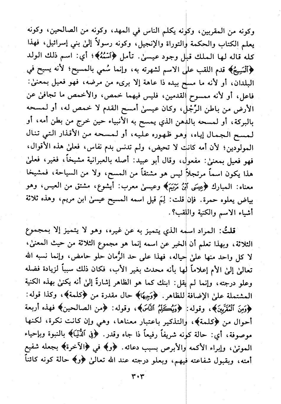 وكونه من المقربين، وكونه يكلم الناس في المهد، وكونه من الصالحين، وكونه يعلم الكتاب والحكمة والتوراة والإنجيل، وكونه رسولًا إلى بني إسرائيل، فهذا كله قاله لها الملك قبل وجود عيسى. تأمل {اسْمُهُ}؛ أي: اسم ذلك الولد {الْمَسِيحُ} قدم اللقب على الاسم لشهرته به، وإنما سُمي بالمسيح؛ لأنه يسيح في البلدان، أو لأنه ما مسح بيده ذا عاهة إلا برىء من مرضه، فهو فعيل بمعنى: فاعل، أو لأنه ممسوح القدمين، فليس فيهما خمص، والأخمص ما تجافى عن الأرض من باطن الرِّجْل، وكان عيسى أمسح القدم لا خمص له، أو لمسحه بالبركة، أو لمسحه بالدهن الذي يمسح به الأنبياء حين خرج من بطن أمه، أو لمسح الجمال إياه، وهو ظهوره عليه، أو لمسحه من الأقذار التي تنال المولودين؛ لأن أمه كانت لا تحيض، ولم تدنس بدم نفاس، فعلى هذه الأقوال، فهو فعيل بمعنى: مفعول، وقال أبو عبيد: أصله بالعبرانية مشيخًا، فغير، فعلى هذا يكون اسمًا مرتجلًا ليس هو مشتقًا من المسح، ولا من السياحة، فمشيخا معناه: المبارك {عِيسَى ابْنُ مَرْيَمَ} وعيسى معرب: أيشوع، مشتق من العيس، وهو بياض يعلوه حمرة. فإن قلت: لِمَ قيل اسمه المسيح عيسى ابن مريم، وهذه ثلاثة أشياء الاسم والكنية واللقب؟.