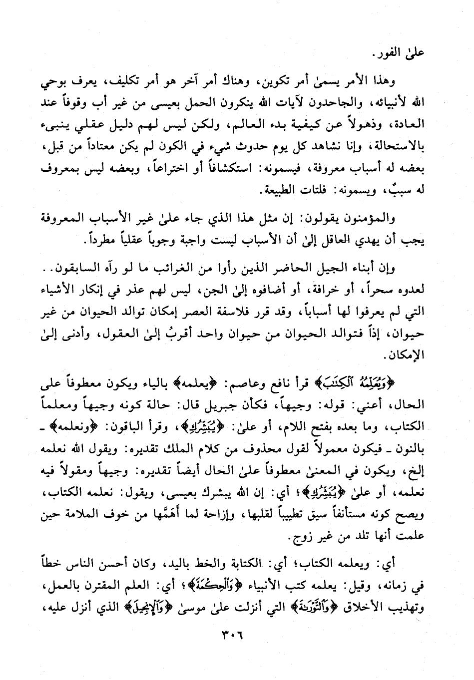 وهذا الأمر يسمى أمر تكوين، وهناك أمر آخر هو أمر تكليف، يعرف بوحي الله لأنبيائه، والجاحدون لآيات الله ينكرون الحمل بعيسى من غير أب وقوفًا عند العادة، وذهولًا عن كيفية بدء العالم، ولكن ليس لهم دليل عقلي ينبيء بالاستحالة، وإنا نشاهد كل يوم حدوث شيء في الكون لم يكن معتادًا من قبل، بعضه له أسباب معروفة، فيسمونه: استكشافًا أو اختراعًا، وبعضه ليس بمعروف له سببٌ، ويسمونه: فلتات الطبيعة.