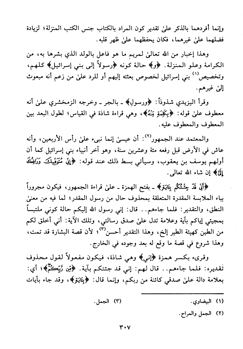 {أَنِّي قَدْ جِئْتُكُمْ بِآيَةٍ} - بفتح الهمزة - على قراءة الجمهور، فيكون مجرورًا بباء الملابسة المقدرة المتعلقة بمحذوف حال من رسول المقدر؛ لما فيه من معنى النطق، والتقدير: فلما جاءهم .. قال: إني رسول الله إليكم حالة كوني ملتبسًا بمجيئي إياكم بآية وعلامة تدل على صدق رسالتي، وتلك الآية: أني أخلق لكم من الطين كهيئة الطير إلخ، وهذا التقدير أحسن (¬3)؛ لأن قصة البشارة قد تمت، وهذا شروع في قصة ما وقع له بعد وجوده في الخارج.