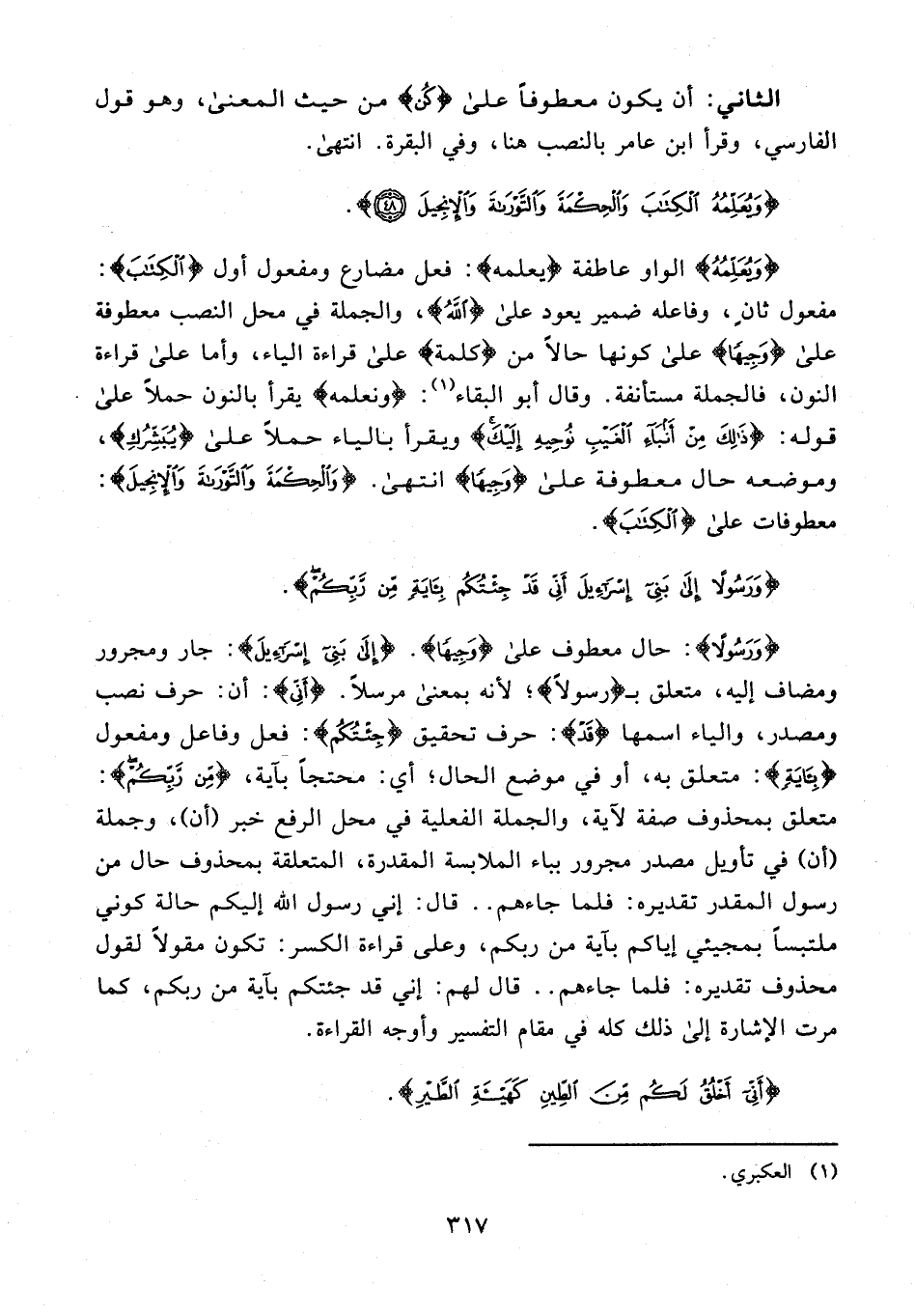 {وَيُعَلِّمُهُ} الواو عاطفة {يعلمه}: فعل مضارع ومفعول أول {الْكِتَابَ}: مفعول ثانٍ، وفاعله ضمير يعود على {اللَّهُ}، والجملة في محل النصب معطوفة على {وَجِيهًا} على كونها حالًا من {كلمة} على قراءة الياء، وأما على قراءة النون، فالجملة مستأنفة. وقال أبو البقاء (¬1): {ونعلمه} يقرأ بالنون حملًا على قوله: {ذَلِكَ مِنْ أَنْبَاءِ الْغَيْبِ نُوحِيهِ إِلَيْكَ} ويقرأ بالياء حملًا على {يُبَشِّرُكِ}، وموضعه حال معطوفة على {وَجِيهًا} انتهى. {وَالْحِكْمَةَ وَالتَّوْرَاةَ وَالْإِنْجِيلَ}: معطوفات على {الْكِتَابَ}.
