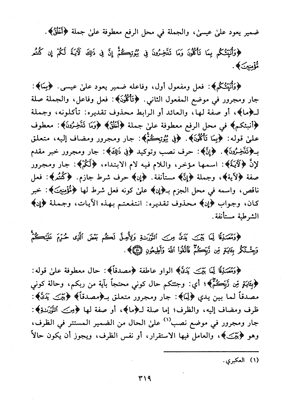 {وَمُصَدِّقًا لِمَا بَيْنَ يَدَيَّ} الواو عاطفة {مصدقًا}: حال معطوفة على قوله: {بِآيَةٍ مِنْ رَبِّكُمْ}؛ أي: وجئتكم حال كوني محتجًا بآية من ربكم، وحالة كوني مصدقًا لما بين يدي {لِمَا}: جار ومجرور متعلق بـ {مصدقًا} {بَيْنَ يَدَيَّ}: ظرف ومضاف إليه، والظرف؛ إما صلة لـ {ما}، أو صفة لها {مِنَ التَّوْرَاةِ}: جار ومجرور في موضع نصب (¬1) على الحال من الضمير المستتر في الظرف، وهو {بَيْنَ}، والعامل فيها الاستقرار، أو نفس الظرف، ويجوز أن يكون حالًا
