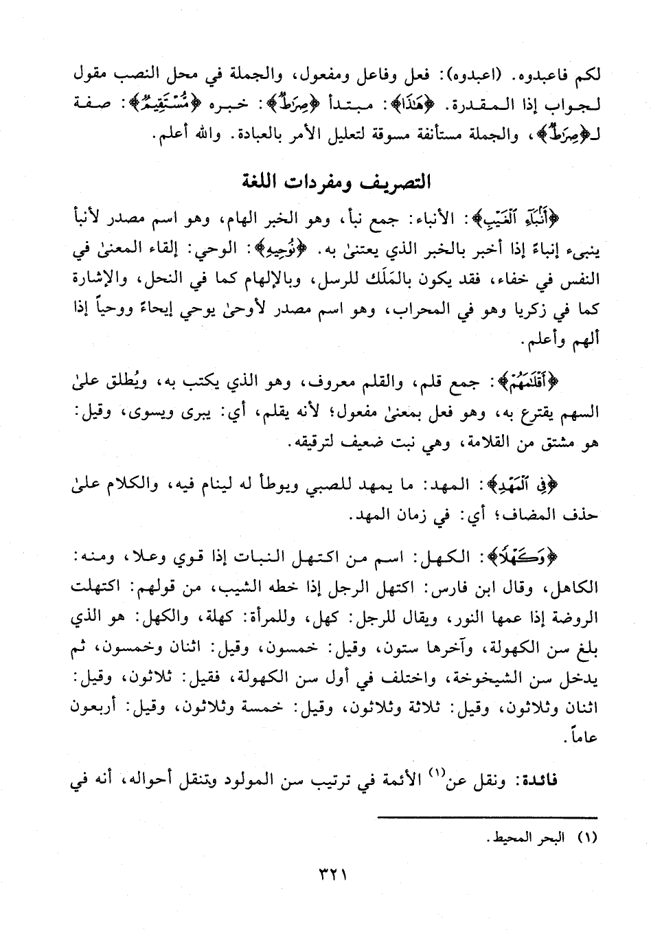 {فِي الْمَهْدِ}: المهد: ما يمهد للصبي ويوطأ له لينام فيه، والكلام على حذف المضاف؛ أي: في زمان المهد.