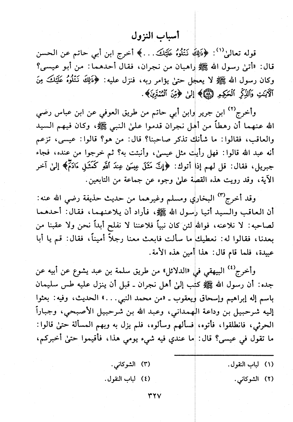قوله تعالى (¬1): {ذَلِكَ نَتْلُوهُ عَلَيْكَ ...} أخرج ابن أبي حاتم عن الحسن قال: "أتى رسول الله - صلى الله عليه وسلم - راهبان من نجران، فقال أحدهما: من أبو عيسى؟ وكان رسول الله - صلى الله عليه وسلم - لا يعجل حتى يؤامر ربه، فنزل عليه: {ذَلِكَ نَتْلُوهُ عَلَيْكَ مِنَ الْآيَاتِ وَالذِّكْرِ الْحَكِيمِ (58)} إلى {مِنَ الْمُمْتَرِينَ}.