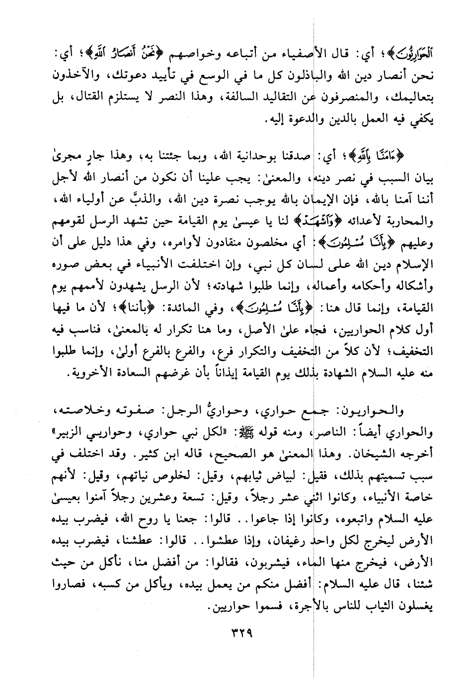 والحواريون: جمع حواري، وحواريُّ الرجل: صفوته وخلاصته، والحواري أيضًا: الناصر، ومنه قوله - صلى الله عليه وسلم -: "لكل نبي حواري، وحواريي الزبير" أخرجه الشيخان. وهذا المعنى هو الصحيح، قاله ابن كثير. وقد اختلف في سبب تسميتهم بذلك، فقيل: لبياض ثيابهم، وقيل: لخلوص نياتهم، وقيل: لأنهم خاصة الأنبياء، وكانوا اثني عشر رجلًا، وقيل: تسعة وعشرين رجلًا آمنوا بعيسى عليه السلام واتبعوه، وكانوا إذا جاعوا .. قالوا: جعنا يا روح الله، فيضرب بيده الأرض ليخرج لكل واحد رغيفان، وإذا عطشوا .. قالوا: عطشنا، فيضرب بيده الأرض، فيخرج منها الماء، فيشربون، فقالوا: من أفضل منا، نأكل من حيث شئنا، قال عليه السلام: أفضل منكم من يعمل بيده، ويأكل من كسبه، فصاروا يغسلون الثياب للناس بالأجرة، فسموا حواريين.