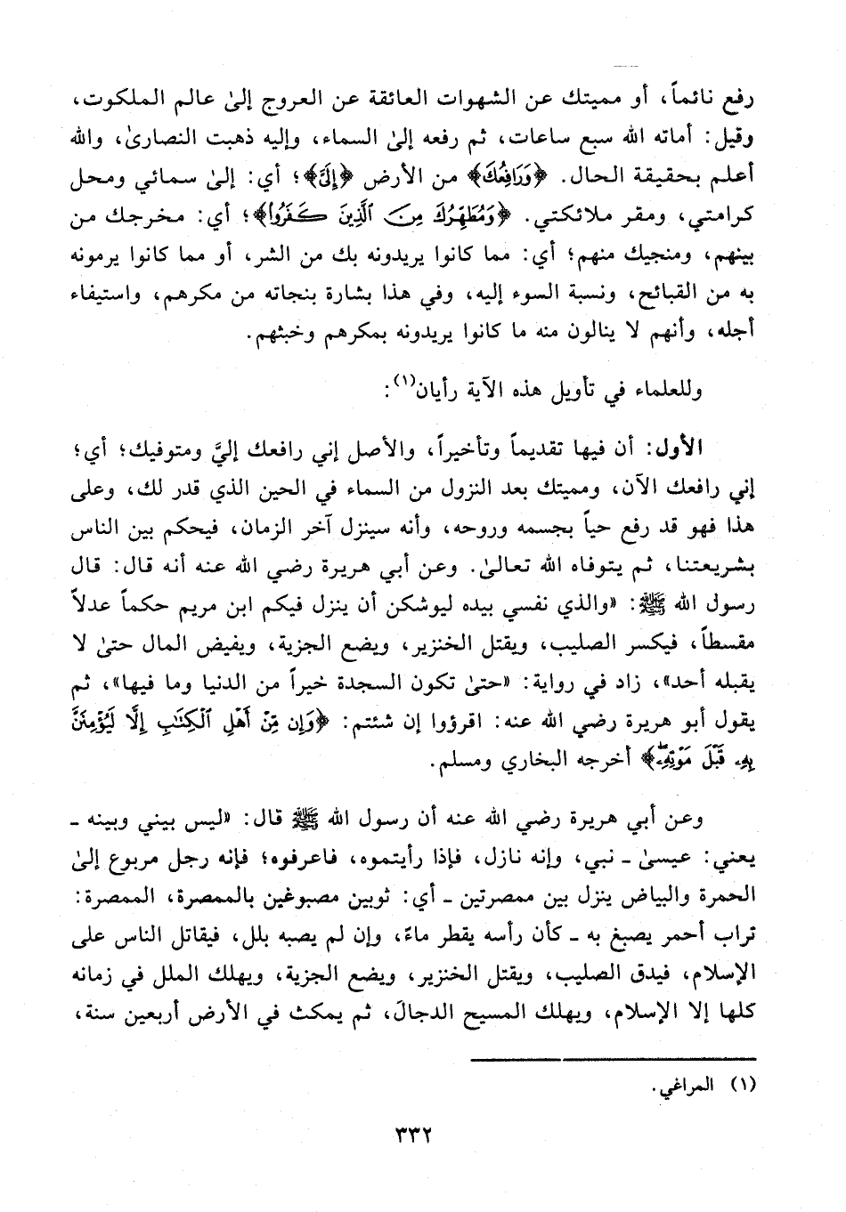 الأول: أن فيها تقديمًا وتأخيرًا، والأصل إني رافعك إليّ ومتوفيك؛ أي؛ إني رافعك الآن، ومميتك بعد النزول من السماء في الحين الذي قدر لك، وعلى هذا فهو رفع حيًّا بجسمه وروحه، وأنه سينزل آخر الزمان، فيحكم بين الناس بشريعتنا، ثم يتوفاه الله تعالى. وعن أبي هريرة رضي الله عنه أنه قال: قال رسول الله - صلى الله عليه وسلم -: "والذي نفسي بيده ليوشكن أن ينزل فيكم ابن مريم حكمًا عدلًا مقسطًا، فيكسر الصليب، ويقتل الخنزير، ويضع الجزية، ويفيض المال حتى لا يقبله أحد"، زاد في رواية: "حتى تكون السجدة خيرًا من الدنيا وما فيها"، ثم يقول أبو هريرة رضي الله عنه: اقرؤوا إن شئتم: {وَإِنْ مِنْ أَهْلِ الْكِتَابِ إِلَّا لَيُؤْمِنَنَّ بِهِ قَبْلَ مَوْتِهِ} أخرجه البخاري ومسلم.