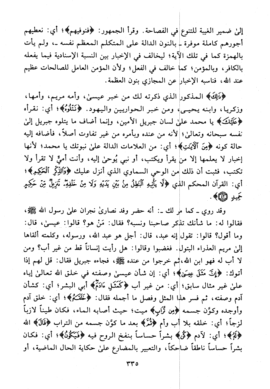 58 - {ذَلِكَ} المذكور الذي ذكرته لك من خبر عيسى، وأمه مريم، وأمها، وزكريا، وابنه يحيى، ومن خبر الحواريين واليهود. {نَتلُوُه}؛ أي: نقرأه {عَلَيْكَ} يا محمَّد على لسان جبريل الأمين، وإنما أضاف ما يتلوه جبريل إلى نفسه سبحانه وتعالى؛ لأنه من عنده وبأمره من غير تفاوت أصلًا، فأضافه إليه حالة كونه {مِنَ الْآيَاتِ}؛ أي: من العلامات الدالة على نبوتك يا محمَّد؛ لأنها إخبار لا يعلمها إلا من يقرأ ويكتب، أو نبي يُوحى إليه، وأنت أميٌّ لا تقرأ ولا تكتب، فثبت أن ذلك من الوحي السماوي الذي أنزل عليك {وَالذِّكْرِ الْحَكِيمِ}؛ أي: القرآن المحكم الذي {لَا يَأْتِيهِ الْبَاطِلُ مِنْ بَيْنِ يَدَيْهِ وَلَا مِنْ خَلْفِهِ تَنْزِيلٌ مِنْ حَكِيمٍ حَمِيدٍ (42)}.