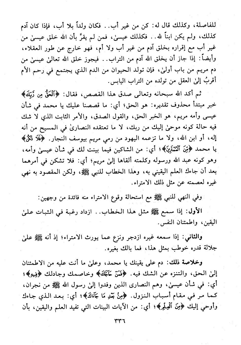 60 - {الحق من ربك} خبر مبتدأ محذوف تقديره: هو الحق؛ أي: ما قصصنا عليك يا محمَّد في شأن عيسى وأمه مريم، هو الخبر الحق، والقول الصدق، والأمر الثابت الذي لا شك فيه حالة كونه موحى إليك من ربك، لا ما تعتقده النصارى في المسيح من أنه إله، أو ابن الله، ولا ما تزعمه اليهود من رمي مريم بيوسف النجار. {فَلَا تَكنُ} يا محمَّد {مِنَ الْمُمْتَرِينَ}؛ أي: من الشاكين فيما بينت لك في شأن عيسى وأمه، وهو كونه عبد الله ورسوله وكلمته ألقاها إلى مريم؛ أي: فلا تشكن في أمرهما بعد أن جاءك العلم اليقيني به، وهذا الخطاب للنبي - صلى الله عليه وسلم -، ولكن المقصود به نهي غيره لعصمته عن مثل ذلك الامتراء.