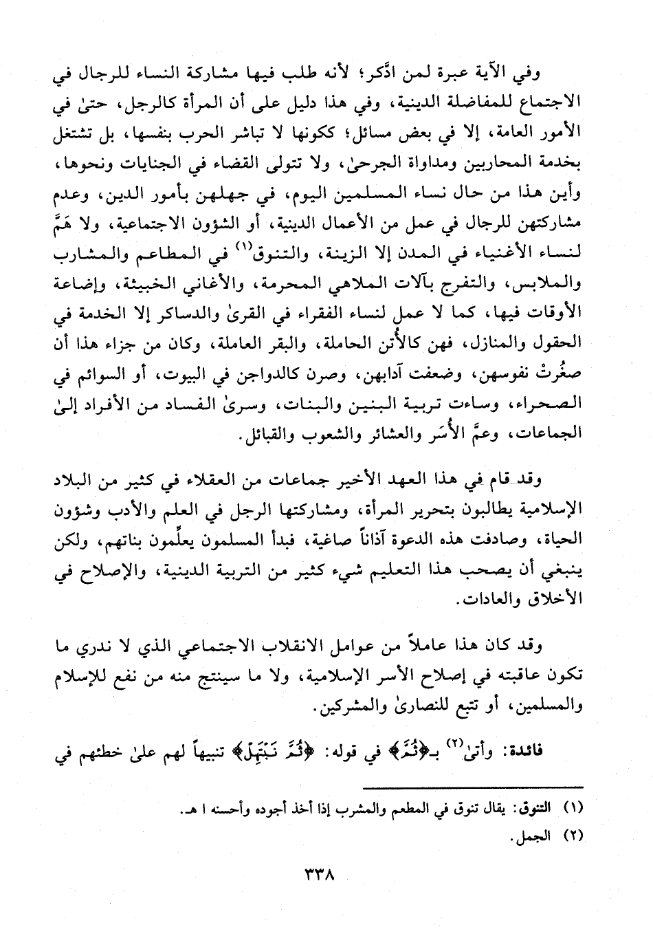وفي الآية عبرة لمن ادَّكر؛ لأنه طلب فيها مشاركة النساء للرجال في الاجتماع للمفاضلة الدينية، وفي هذا دليل على أن المرأة كالرجل، حتى في الأمور العامة، إلا في بعض مسائل؛ ككونها لا تباشر الحرب بنفسها، بل تشتغل بخدمة المحاربين ومداواة الجرحى، ولا تتولى القضاء في الجنايات ونحوها، وأين هذا من حال نساء المسلمين اليوم، في جهلهن بأمور الدين، وعدم مشاركتهن للرجال في عمل من الأعمال الدينية، أو الشؤون الاجتماعية، ولا هَمَّ لنساء الأغنياء في المدن إلا الزينة، والتنوق (¬1) في المطاعم والمشارب والملابس، والتفرج بآلات الملاهي المحرمة، والأغاني الخبيثة، وإضاعة الأوقات فيها، كما لا عمل لنساء الفقراء في القرى والدساكر إلا الخدمة في الحقول والمنازل، فهن كالأُتن الحاملة، والبقر العاملة، وكان من جزاء هذا أن صغُرتْ نفوسهن، وضعفت آدابهن، وصرن كالدواجن في البيوت، أو السوائم في الصحراء، وساءت تربية البنين والبنات، وسرى الفساد من الأفراد إلى الجماعات، وعمَّ الأُسَر والعشائر والشعوب والقبائل.