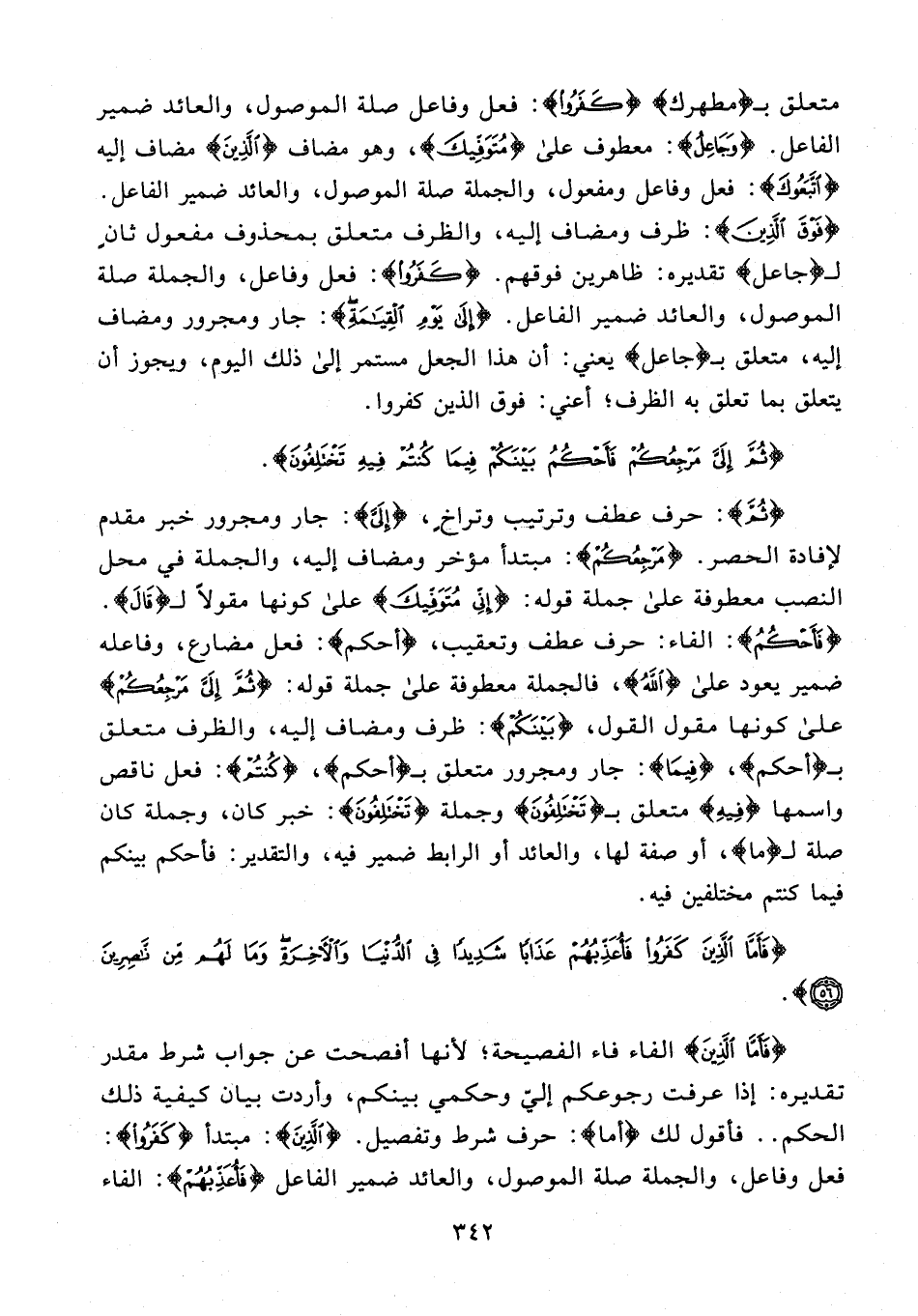 {ثُمَّ}: حرف عطف وترتب وتراخٍ، {إِلَيَّ}: جار ومجرور خبر مقدم لإفادة الحصر. {مَرْجِعُكُمْ}: مبتدأ مؤخر ومضاف إليه، والجملة في محل النصب معطوفة على جملة قوله: {إِنِّي مُتَوَفِّيكَ} على كونها مقولًا لـ {قَالَ}. {فَأَحْكُمُ}: الفاء: حرف عطف وتعقيب، {أحكم}: فعل مضارع، وفاعله ضمير يعود على {اللَّهُ}، فالجملة معطوفة على جملة قوله: {ثُمَّ إِلَيَّ مَرْجِعُكُمْ} على كونها مقول القول، {بَيْنَكُمْ}: ظرف ومضاف إليه، والظرف متعلق بـ {أحكم}، {فِيمَا}: جار ومجرور متعلق بـ {أحكم}، {كُنْتُمْ}: فعل ناقص واسمها {فِيهِ} متعلق بـ {تَخْتَلِفُونَ} وجملة {تَخْتَلِفُونَ}: خبر كان، وجملة كان صلة لـ {ما}، أو صفة لها، والعائد أو الرابط ضمير فيه، والتقدير: فأحكم بينكم فيما كنتم مختلفين فيه.