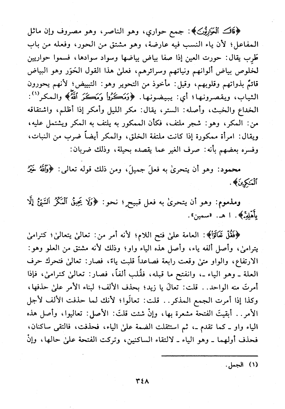 {قَالَ الْحَوَارِيُّونَ}: جمع حواري، وهو الناصر، وهو مصروف وإن ماثل المفاعل؛ لأن ياء النسب فيه عارضة، وهو مشتق من الحور، وفعله من باب طَرِب يقال: حورت العين إذا صفا بياض بياضا وسواد سوادها، فسموا حواريين لخلوص بياض ألوانهم ونياتهم وسرائرهم، فعلى هذا القول الحَوَر وهو البياض قائمٌ بذواتهم وقلوبهم، وقيل: مأخوذ من التحوير وهو: التبييض؛ لأنهم يحورون الثياب، ويقصرونا؛ أي: يبيضونها. {وَمَكَرُوا وَمَكَرَ اللَّهُ} والمكر (¬1): الخداع والخبث، وأصله: الستر، يقال: مكر الليل وأمكر إذا أظلم، واشتقاقه من: المكر، وهو: شجر ملتف، فكأن المذكور به يلتف به المكر ويشتمل عليه ويقال: امرأة ممكورة إذا كانت ملتفة الخلق، والمكر أيضًا ضرب من النبات، وفسره بعضم بأنه: صرف الغير عما يقصده بحيلة، وذلك ضربان: