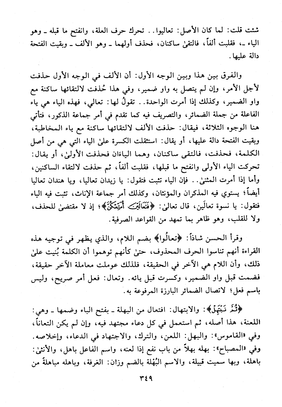 وقرأ الحسن شاذًا: {تعالُوا} بضم اللام، والذي يظهر في توجيه هذه القراءة أنهم تناسوا الحرف المحذوف، حتى كأنهم توهموا أن الكلمة بُنيت على ذلك، وأن اللام هي الآخر في الحقيقة، فلذلك عوملت معاملة الآخر حقيقة، فضمت قبل واو الضمير، وكسرت قبل يائه. وتعال: فعل أمر صريح، وليس باسم فعل؛ لاتصال الضمائر البارزة المرفوعة به.