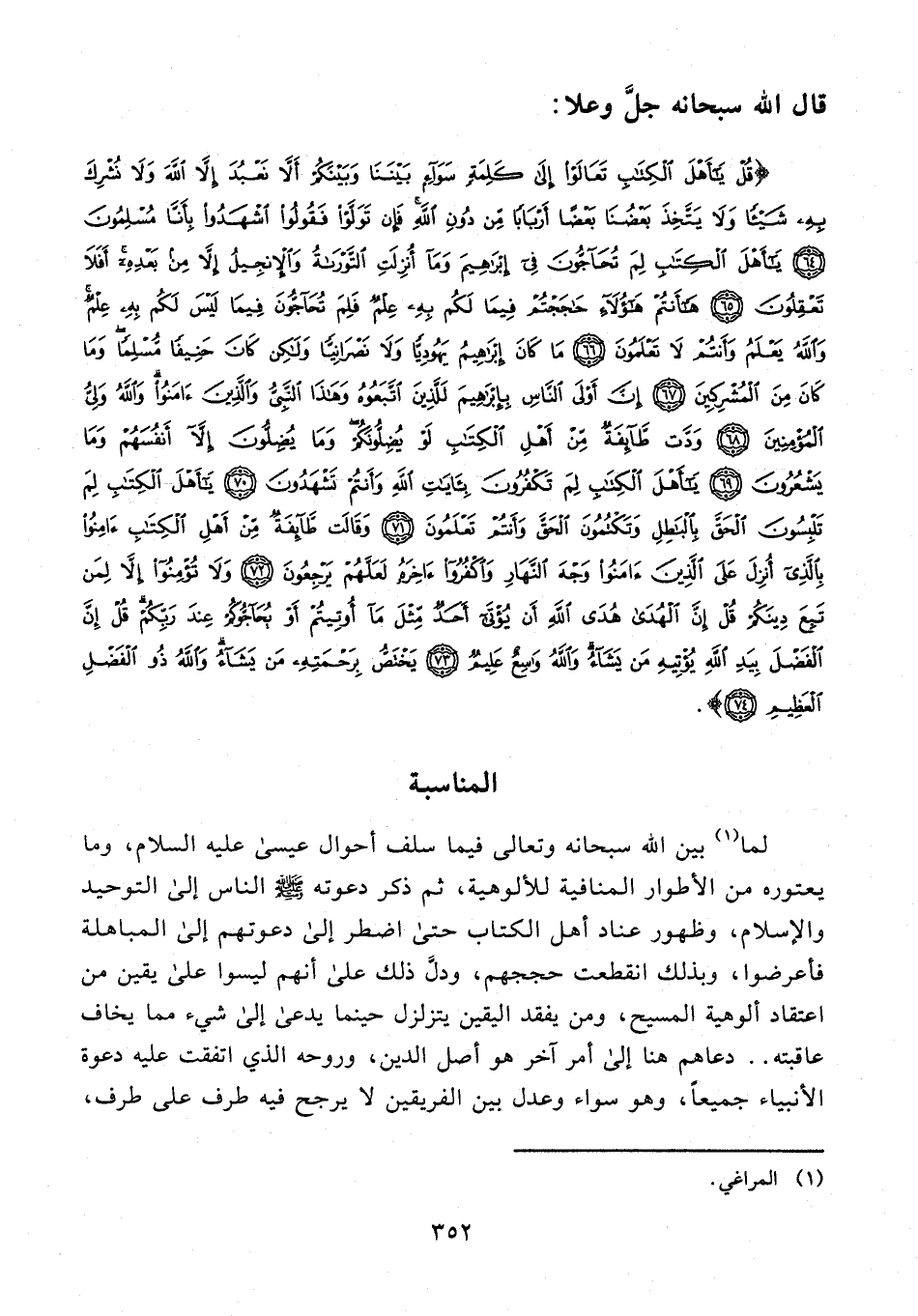 {قُلْ يَا أَهْلَ الْكِتَابِ تَعَالَوْا إِلَى كَلِمَةٍ سَوَاءٍ بَيْنَنَا وَبَيْنَكُمْ أَلَّا نَعْبُدَ إِلَّا اللَّهَ وَلَا نُشْرِكَ بِهِ شَيْئًا وَلَا يَتَّخِذَ بَعْضُنَا بَعْضًا أَرْبَابًا مِنْ دُونِ اللَّهِ فَإِنْ تَوَلَّوْا فَقُولُوا اشْهَدُوا بِأَنَّا مُسْلِمُونَ (64) يَا أَهْلَ الْكِتَابِ لِمَ تُحَاجُّونَ فِي إِبْرَاهِيمَ وَمَا أُنْزِلَتِ التَّوْرَاةُ وَالْإِنْجِيلُ إِلَّا مِنْ بَعْدِهِ أَفَلَا تَعْقِلُونَ (65) هَا أَنْتُمْ هَؤُلَاءِ حَاجَجْتُمْ فِيمَا لَكُمْ بِهِ عِلْمٌ فَلِمَ تُحَاجُّونَ فِيمَا لَيْسَ لَكُمْ بِهِ عِلْمٌ وَاللَّهُ يَعْلَمُ وَأَنْتُمْ لَا تَعْلَمُونَ (66) مَا كَانَ إِبْرَاهِيمُ يَهُودِيًّا وَلَا نَصْرَانِيًّا وَلَكِنْ كَانَ حَنِيفًا مُسْلِمًا وَمَا كَانَ مِنَ الْمُشْرِكِينَ (67) إِنَّ أَوْلَى النَّاسِ بِإِبْرَاهِيمَ لَلَّذِينَ اتَّبَعُوهُ وَهَذَا النَّبِيُّ وَالَّذِينَ آمَنُوا وَاللَّهُ وَلِيُّ الْمُؤْمِنِينَ (68) وَدَّتْ طَائِفَةٌ مِنْ أَهْلِ الْكِتَابِ لَوْ يُضِلُّونَكُمْ وَمَا يُضِلُّونَ إِلَّا أَنْفُسَهُمْ وَمَا يَشْعُرُونَ (69) يَا أَهْلَ الْكِتَابِ لِمَ تَكْفُرُونَ بِآيَاتِ اللَّهِ وَأَنْتُمْ تَشْهَدُونَ (70) يَا أَهْلَ الْكِتَابِ لِمَ تَلْبِسُونَ الْحَقَّ بِالْبَاطِلِ وَتَكْتُمُونَ الْحَقَّ وَأَنْتُمْ تَعْلَمُونَ (71) وَقَالَتْ طَائِفَةٌ مِنْ أَهْلِ الْكِتَابِ آمِنُوا بِالَّذِي أُنْزِلَ عَلَى الَّذِينَ آمَنُوا وَجْهَ النَّهَارِ وَاكْفُرُوا آخِرَهُ لَعَلَّهُمْ يَرْجِعُونَ (72) وَلَا تُؤْمِنُوا إِلَّا لِمَنْ تَبِعَ دِينَكُمْ قُلْ إِنَّ الْهُدَى هُدَى اللَّهِ أَنْ يُؤْتَى أَحَدٌ مِثْلَ مَا أُوتِيتُمْ أَوْ يُحَاجُّوكُمْ عِنْدَ رَبِّكُمْ قُلْ إِنَّ الْفَضْلَ بِيَدِ اللَّهِ يُؤْتِيهِ مَنْ يَشَاءُ وَاللَّهُ وَاسِعٌ عَلِيمٌ (73) يَخْتَصُّ بِرَحْمَتِهِ مَنْ يَشَاءُ وَاللَّهُ ذُو الْفَضْلِ الْعَظِيمِ (74)}.