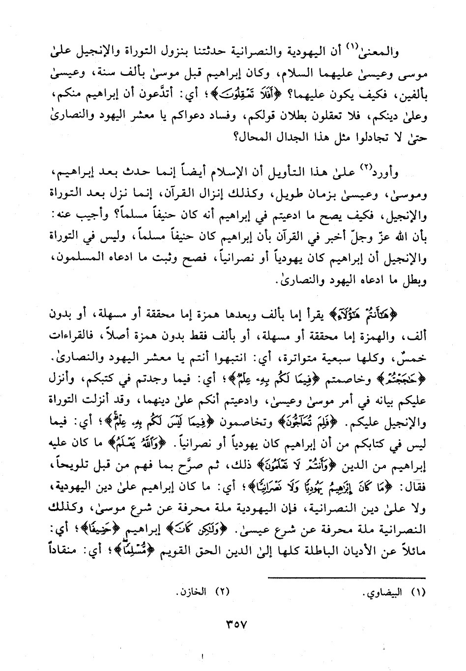 66 - {هَاأَنْتُمْ هَؤُلَاءِ} يقرأ إما بألف وبعدها همزة إما محققة أو مسهلة، أو بدون ألف، والهمزة إما محققة أو مسهلة، أو بألف فقط بدون همزة أصلًا، فالقراءات خمسٌ، وكلها سبعية متواترة، أي: انتبهوا أنتم يا معشر اليهود والنصارى. {حَاجَجْتُمْ} وخاصمتم {فِيمَا لَكُمْ بِهِ عِلْمٌ}؛ أي: فيما وجدتم في كتبكم، وأنزل عليكم بيانه في أمر موسى وعيسى، وادعيتم أنكم على دينهما، وقد أنزلت التوراة. والإنجيل عليكم. {فَلِمَ تُحَآجُّونَ} وتخاصمون {فِيمَا لَيْسَ لَكُمْ بِهِ عِلْمٌ}؛ أي: فيما ليس في كتابكم من أن إبراهيم كان يهوديًّا أو نصرانيًّا. {وَاللَّهُ يَعْلَمُ} ما كان عليه إبراهيم من الدين {وَأَنْتُمْ لَا تَعْلَمُونَ} ذلك، ثم صرَّح بما فهم من قبل تلويحًا، فقال: