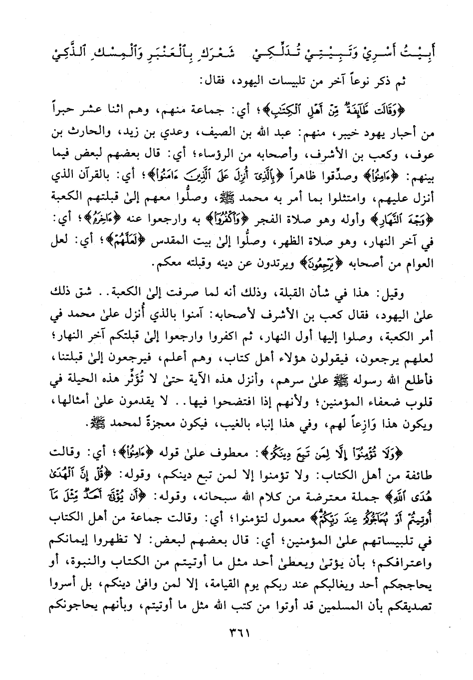 وقيل: هذا في شأن القبلة، وذلك أنه لما صرفت إلى الكعبة .. شق ذلك على اليهود، فقال كعب بن الأشرف لأصحابه: آمنوا بالذي أُنزل على محمَّد في أمر الكعبة، وصلوا إليها أول النهار، ثم اكفروا وارجعوا إلى قبلتكم آخر النهار؛ لعلهم يرجعون، فيقولون هؤلاء أهل كتاب، وهم أعلم، فيرجعون إلى قبلتنا، فأطلع الله رسوله - صلى الله عليه وسلم - على سرهم، وأنزل هذه الآية حتى لا تُؤَثِّر هذه الحيلة في قلوب ضعفاء المؤمنين؛ ولأنهم إذا افتضحوا فيها .. لا يقدمون على أمثالها، ويكون هذا وَازِعًا لهم، وفي هذا إنباء بالغيب، فيكون معجزةً لمحمد - صلى الله عليه وسلم -.