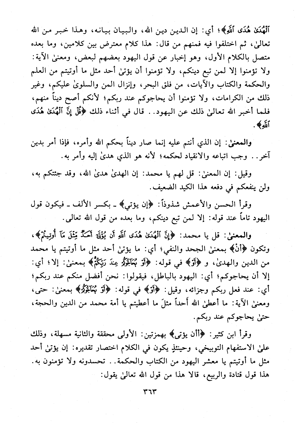 الْهُدَى هُدَى اللَّهِ}؛ أي: إن الدين دين الله، والبيان بيانه، وهذا خبر من الله تعالى، ثم اختلفوا فيه فمنهم من قال: هذا كلام معترض بين كلامين، وما بعده متصل بالكلام الأول، وهو إخبار عن قول اليهود بعضهم لبعض، ومعنى الآية: ولا تؤمنوا إلا لمن تبع دينكم، ولا تؤمنوا أن يؤتى أحد مثل ما أوتيتم من العلم والحكمة والكتاب والآيات، من فلق البحر، وإنزال المن والسلوى عليكم، وغير ذلك من الكرامات، ولا تؤمنوا أن يحاجوكم عند ربكم؛ لأنكم أصح دينًا منهم، فلما أخبر الله تعالى ذلك عن اليهود .. قال في أثناء ذلك {قُلْ إِنَّ الْهُدَى هُدَى اللَّهِ}.
