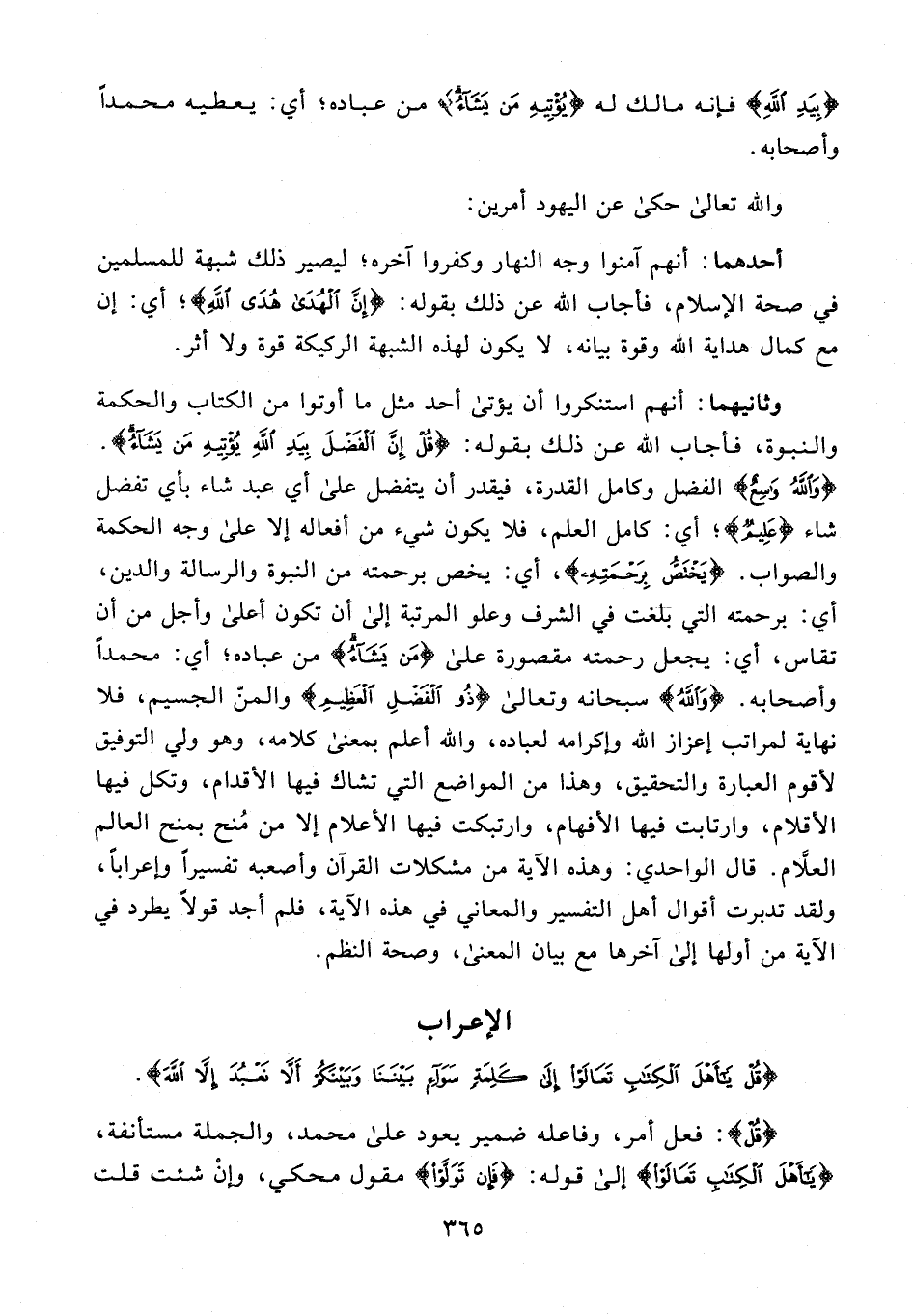 وثانيهما: أنهم استنكروا أن يؤتى أحد مثل ما أوتوا من الكتاب والحكمة والنبوة، فأجاب الله عن ذلك بقوله: {قُلْ إِنَّ الْفَضْلَ بِيَدِ اللَّهِ يُؤْتِيهِ مَنْ يَشَاءُ}. {وَاللَّهُ وَاسِعٌ} الفضل وكامل القدرة، فيقدر أن يتفضل على أي عبد شاء بأي تفضل شاء {عَلِيمٌ}؛ أي: كامل العلم، فلا يكون شيء من أفعاله إلا على وجه الحكمة والصواب.