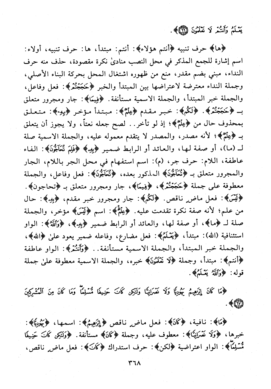 {مَا}: نافية، {كاَنَ}: فعل ماضٍ ناقص {إِبْرَاهِيمُ}: اسمها، {يَهُودِيًّا}: خبرها، {وَلَا نَصْرَانِيًّا}: معطوف عليه، وجملة {كَانَ} مستأنفة. {وَلَكِنْ كَانَ حَنِيفًا مُسْلِمًا}: الواو اعتراضية {لكن}: حرف استدراك {كَانَ}: فعل ماضٍ ناقص،