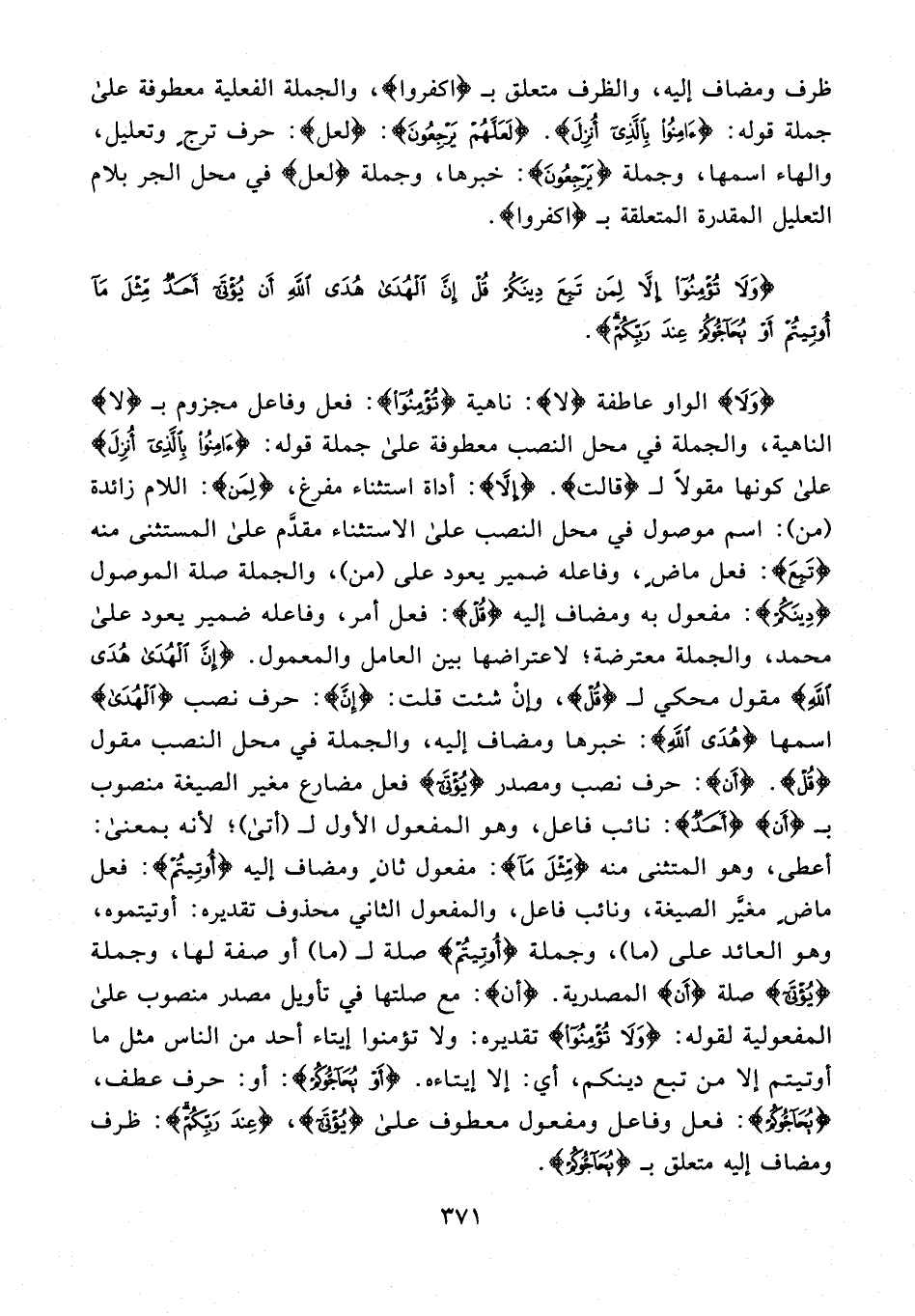 73 - {وَلَا} الواو عاطفة {لا}: ناهية {تُؤْمِنُوا}: فعل وفاعل مجزوم بـ {لا} الناهية، والجملة في محل النصب معطوفة على جملة قوله: {آمِنُوا بِالَّذِي أُنْزِلَ} على كونها مقولًا لـ {قالت}. {إِلَّا}: أداة استثناء مفرغ، {لِمَن}: اللام زائدة (من): اسم موصول في محل النصب على الاستثناء مقدَّم على المستثنى منه {تَبِعَ}: فعل ماضٍ، وفاعله ضمير يعود على (من)، والجملة صلة الموصول {دِينَكُمْ}: مفعول به ومضاف إليه {قُلْ}: فعل أمر، وفاعله ضمير يعود على محمَّد، والجملة معترضة؛ لاعتراضها بين العامل والمعمول. {قُلْ إِنَّ الْهُدَى هُدَى اللَّهِ} مقول محكي لـ {قُلْ}، وإنْ شئت قلت: {إِنَّ}: حرف نصب {الْهُدَى} اسمها {هُدَى اللَّهِ}: خبرها ومضاف إليه، والجملة في محل النصب مقول {قُلْ}. {أَن}: حرف نصب ومصدر {يُؤْتَى} فعل مضارع مغير الصيغة منصوب بـ {أَن} {أَحَدٌ}: نائب فاعل، وهو المفعول الأول لـ (أتى)؛ لأنه بمعنى: أعطى، وهو المستثنى منه {مِثْلَ مَا}: مفعول ثانٍ ومضاف إليه {أُوتِيتُمْ}: فعل ماضٍ مغيَّر الصيغة، ونائب فاعل، والمفعول الثاني محذوف تقديره: أوتيتموه، وهو العائد على (ما)، وجملة {أُوتِيتُمْ} صلة لـ (ما) أو صفة لها، وجملة {يُؤْتَى} صلة {أَن} المصدرية. {أن}: مع صلتها في تأويل مصدر منصوب على المفعولية لقوله: {وَلَا تُؤْمِنُوا} تقديره: ولا تؤمنوا إيتاء أحد من الناس مثل ما أوتيتم إلا من تبع دينكم، أي: إلا إيتاءه. {أَوْ يُحَاجُّوكُمْ}: أو: حرف عطف، {يُحَاجُّوكُمْ}: فعل وفاعل ومفعول معطوف على {يُؤْتَى}، {عِنْدَ رَبِّكُمْ}: ظرف ومضاف إليه متعلق بـ {يُحَاجُّوكُمْ}.