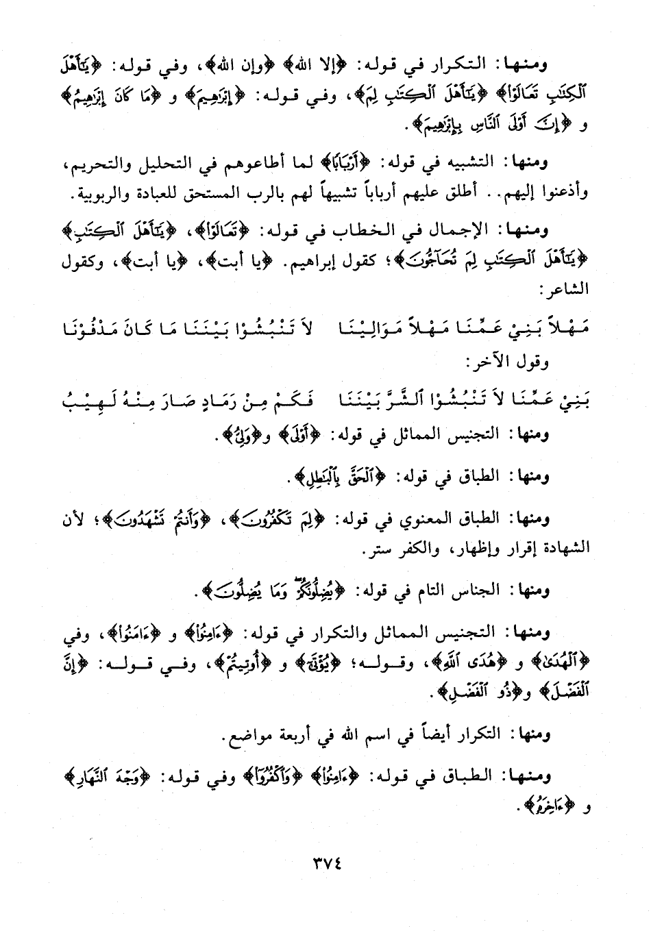 ومنها: الإجمال في الخطاب في قوله: {تَعَالَوْا}، {يَا أَهْلَ الْكِتَابِ} {يَا أَهْلَ الْكِتَابِ لِمَ تُحَاجُّونَ}؛ كقول إبراهيم. {يا أبت}، {يا أبت}، وكقول الشاعر: