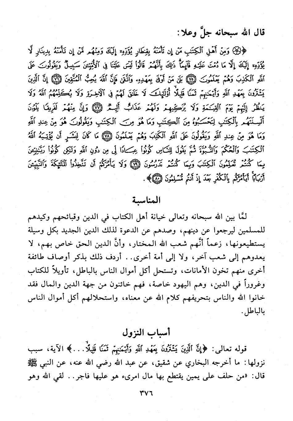 {وَمِنْ أَهْلِ الْكِتَابِ مَنْ إِنْ تَأْمَنْهُ بِقِنْطَارٍ يُؤَدِّهِ إِلَيْكَ وَمِنْهُمْ مَنْ إِنْ تَأْمَنْهُ بِدِينَارٍ لَا يُؤَدِّهِ إِلَيْكَ إِلَّا مَا دُمْتَ عَلَيْهِ قَائِمًا ذَلِكَ بِأَنَّهُمْ قَالُوا لَيْسَ عَلَيْنَا فِي الْأُمِّيِّينَ سَبِيلٌ وَيَقُولُونَ عَلَى اللَّهِ الْكَذِبَ وَهُمْ يَعْلَمُونَ (75) بَلَى مَنْ أَوْفَى بِعَهْدِهِ وَاتَّقَى فَإِنَّ اللَّهَ يُحِبُّ الْمُتَّقِينَ (76) إِنَّ الَّذِينَ يَشْتَرُونَ بِعَهْدِ اللَّهِ وَأَيْمَانِهِمْ ثَمَنًا قَلِيلًا أُولَئِكَ لَا خَلَاقَ لَهُمْ فِي الْآخِرَةِ وَلَا يُكَلِّمُهُمُ اللَّهُ وَلَا يَنْظُرُ إِلَيْهِمْ يَوْمَ الْقِيَامَةِ وَلَا يُزَكِّيهِمْ وَلَهُمْ عَذَابٌ أَلِيمٌ (77) وَإِنَّ مِنْهُمْ لَفَرِيقًا يَلْوُونَ أَلْسِنَتَهُمْ بِالْكِتَابِ لِتَحْسَبُوهُ مِنَ الْكِتَابِ وَمَا هُوَ مِنَ الْكِتَابِ وَيَقُولُونَ هُوَ مِنْ عِنْدِ اللَّهِ وَمَا هُوَ مِنْ عِنْدِ اللَّهِ وَيَقُولُونَ عَلَى اللَّهِ الْكَذِبَ وَهُمْ يَعْلَمُونَ (78) مَا كَانَ لِبَشَرٍ أَنْ يُؤْتِيَهُ اللَّهُ الْكِتَابَ وَالْحُكْمَ وَالنُّبُوَّةَ ثُمَّ يَقُولَ لِلنَّاسِ كُونُوا عِبَادًا لِي مِنْ دُونِ اللَّهِ وَلَكِنْ كُونُوا رَبَّانِيِّينَ بِمَا كُنْتُمْ تُعَلِّمُونَ الْكِتَابَ وَبِمَا كُنْتُمْ تَدْرُسُونَ (79) وَلَا يَأْمُرَكُمْ أَنْ تَتَّخِذُوا الْمَلَائِكَةَ وَالنَّبِيِّينَ أَرْبَابًا أَيَأْمُرُكُمْ بِالْكُفْرِ بَعْدَ إِذْ أَنْتُمْ مُسْلِمُونَ (80)}.