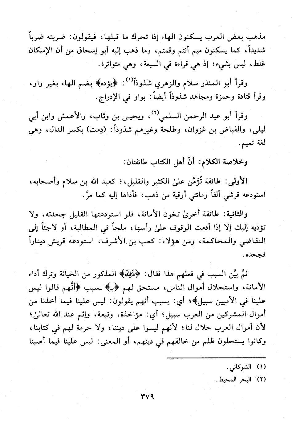 والثانية: طائفة أخرى تخون الأمانة، فلو استودعتها القليل جحدته، ولا تؤديه إليك إلا إذا أدمت الوقوف على رأسها، ملحًا في المطالبة، أو لاجئًا إلى التقاضي والمحاكمة، ومن هؤلاء: كعب بن الأشرف، استودعه قريش دينارًا فجحده.