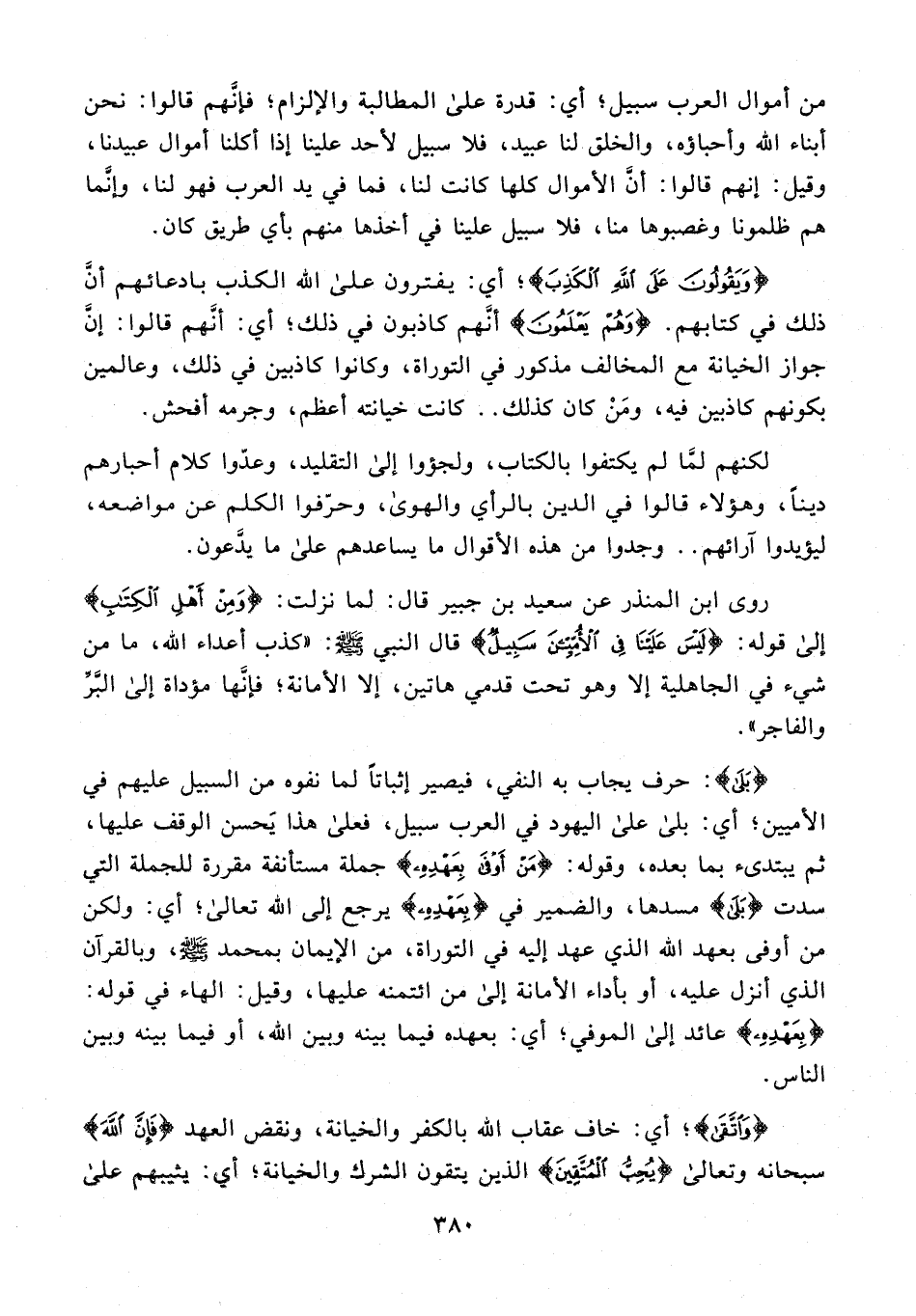76 - {بَلَى}: حرف يجاب به النفي، فيصير إثباتًا لما نفوه من السبيل عليهم في الأميين؛ أي: بلى على اليهود في العرب سبيل، فعلى هذا يَحسن الوقف عليها، ثم يبتدىء بما بعده، وقوله: {مَنْ أَوْفَى بِعَهْدِهِ} جملة مستأنفة مقرر للجملة التي سدت {بَلى} مسدها، والضمير في {بِعَهْدِهِ} يرجع إلى الله تعالى؛ أي: ولكن من أوفى بعهد الله الذي عهد إليه في التوراة، من الإيمان بمحمد - صلى الله عليه وسلم -، وبالقرآن الذي أنزل عليه، أو بأداء الأمانة إلى من ائتمنه عليها، وقيل: الهاء في قوله: {بِعَهْدِهِ} عائد إلى الموفي؛ أي: بيعده فيما بينه وبين الله، أو فيما بينه وبين الناس.