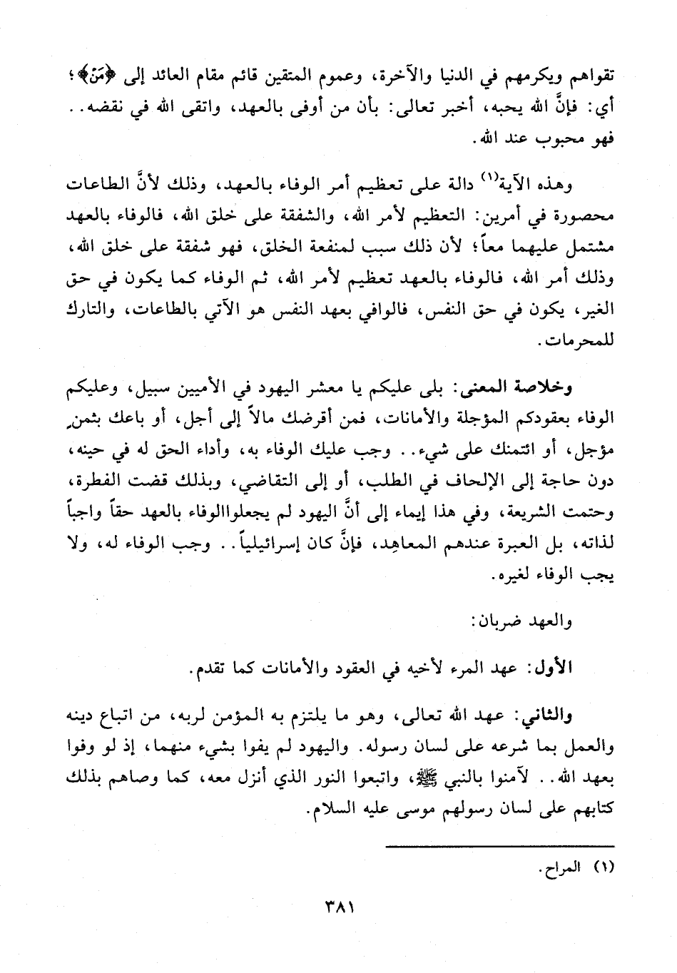 والثاني: عهد الله تعالى، وهو ما يلتزم به المؤمن لربه، من اتباع دينه والعمل بما شرعه على لسان رسوله. واليهود لم يفوا بشيء منهما، إذ لو وفوا بعهد الله .. لآمنوا بالنبي - صلى الله عليه وسلم -، واتبعوا النور الذي أنزل معه، كما وصاهم بذلك كتابهم على لسان رسولهم موسى عليه السلام.