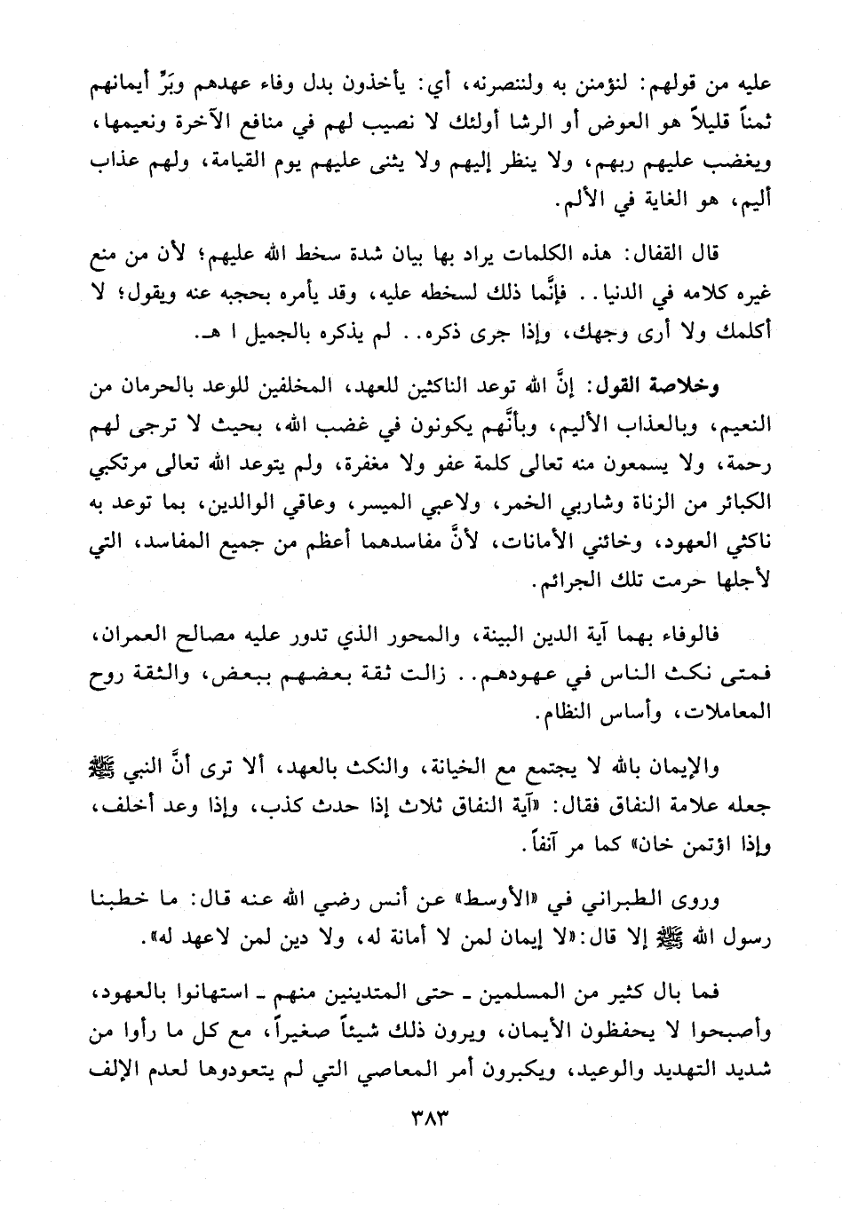 وخلاصة القول: إنَّ الله توعد الناكثين للعهد، المخلفين للوعد بالحرمان من النعيم، وبالعذاب الأليم، وبأنَّهم يكونون في غضب الله، بحيث لا ترجى لهم رحمة، ولا يسمعون منه تعالى كلمة عفو ولا مغفرة، ولم يتوعد الله تعالى مرتكبي الكبائر من الزناة وشاربي الخمر، ولاعبي الميسر، وعاقي الوالدين، بما توعد به ناكثي العهود، وخائني الأمانات؛ لأنَّ مفاسدهما أعظم من جميع المفاسد، التي لأجلها حرمت تلك الجرائم.