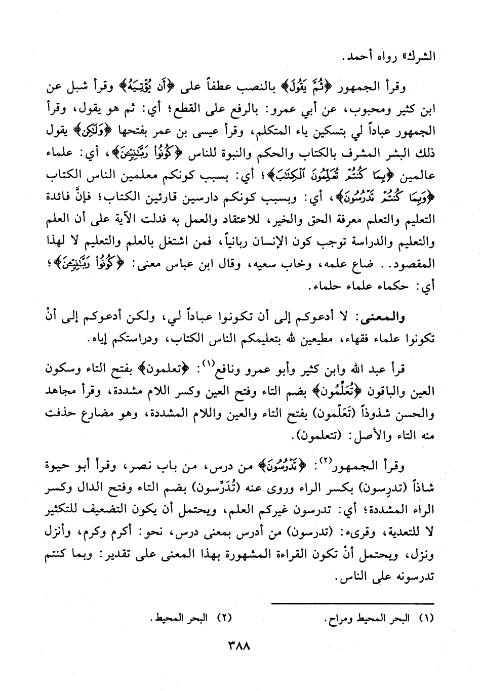 وقرأ الجمهور {ثُمَّ يَقُولَ} بالنصب عطفًا على {أَن يُؤتِيَهُ} وقرأ شبل عن ابن كثير ومحبوب، عن أبي عمرو: بالرفع على القطع؛ أي: ثم هو يقول، وقرأ الجمهور عبادًا لي بتسكين ياء المتكلم، وقرأ عيسى بن عمر بفتحها {وَلَكِنْ} يقول ذلك البشر المشرف بالكتاب والحكم والنبوة للناس {كُونُوا رَبَّانِيِّينَ}، أي: علماء عالمين {بِمَا كُنْتُمْ تُعَلِّمُونَ الْكِتَابَ}؛ أي: بسبب كونكم معلمين الناس الكتاب {وَبِمَا كُنْتُمْ تَدْرُسُونَ}، أي: وبسبب كونكم دارسين قارئين الكتاب؛ فإنَّ فائدة التعليم والتعلم معرفة الحق والخير، للاعتقاد والعمل به فدلت الآية على أن العلم والتعليم والدراسة توجب كون الإنسان ربانيًّا، فمن اشتغل بالعلم والتعليم لا لهذا المقصود .. ضاع علمه، وخاب سعيه، وقال ابن عباس معنى: {كُونُوا رَبَّانِيِّينَ}؛ أي: حكماء علماء حلماء.