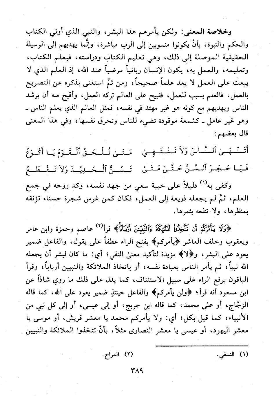 وخلاصة المعنى: ولكن يأمرهم هذا البشر، والنبي الذي أوتي الكتاب والحكم والنبوة، بأنْ يكونوا منسوبين إلى الرب مباشرة، وإنَّما يهديهم إلى الوسيلة الحقيقية الموصلة إلى ذلك، وهي تعليم الكتاب ودراسته، فبعلم الكتاب، وتعليمه، والعمل به، يكون الإنسان ربانيًّا مرضيًّا عند الله، إذ العلم الذي لا يبعث على العمل لا يعد علمًا صحيحًا، ومن ثمَّ استغنى بذكره عن التصريح بالعمل، فالعلم بسبب للعمل، فقبيح على العالم تركه العمل، وأقبح منه أن يرشد الناس ويهديهم مع كونه هو غير مهتد في نفسه، فمثل العالم الذي يعلم الناس - وهو غير عامل - كشمعة موقودة تضيء للناس وتحرق نفسها، وفي هذا المعنى قال بعضهم:
