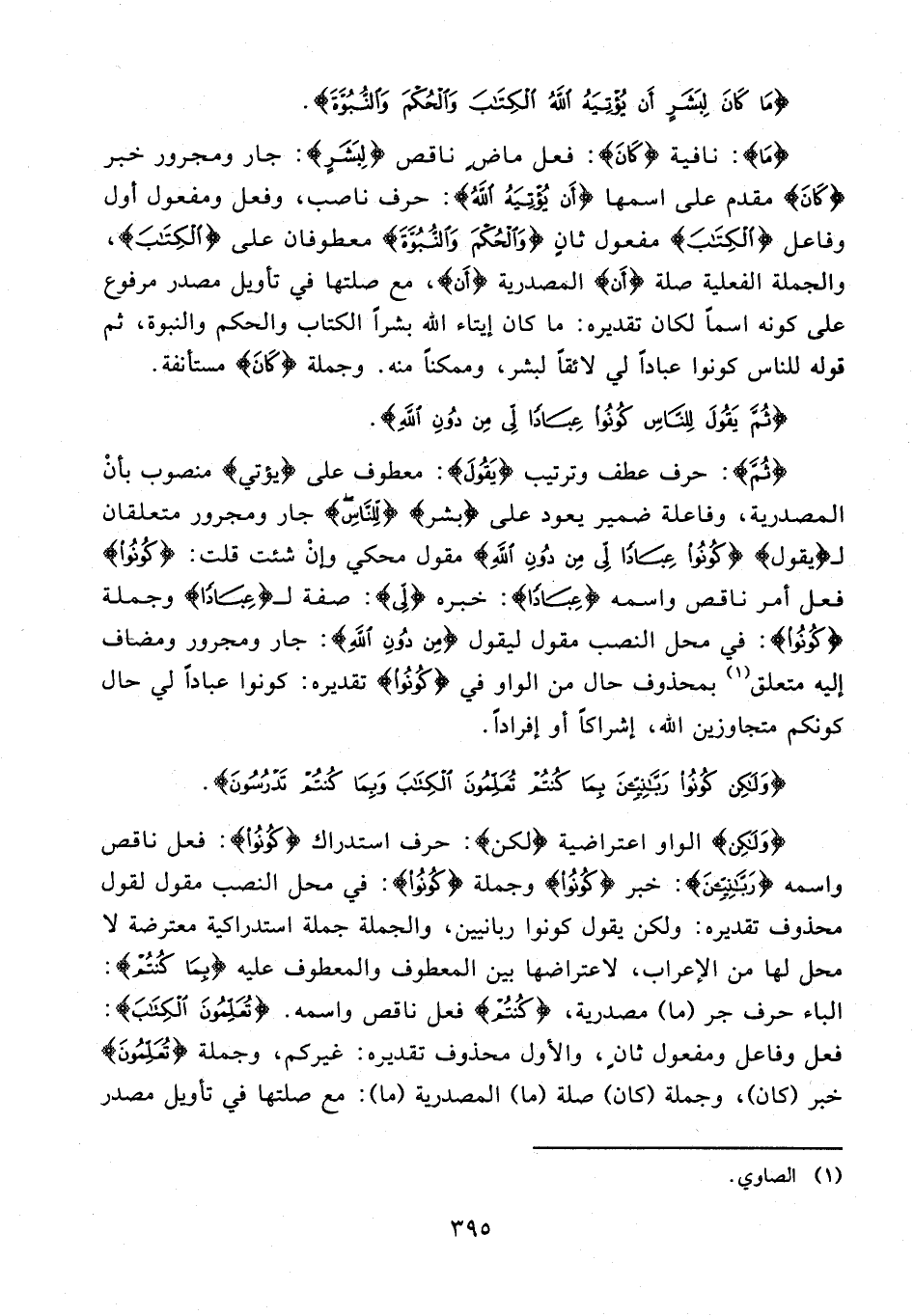 {وَلَكِنْ} الواو اعتراضية {لكن}: حرف استدراك {كوُنُوا}: فعل ناقص واسمه {رَبَّانِيِّينَ}: خبر {كُونُوا} وجملة {كُونُوا}: في محل النصب مقول لقول محذوف تقديره: ولكن يقول كونوا ربانيين، والجملة جملة استدراكية معترضة لا محل لها من الإعراب، لاعتراضها بين المعطوف والمعطوف عليه {بِمَا كُنْتُمْ}: الباء حرف جر (ما) مصدرية، {كُنْتُمْ} فعل ناقص واسمه. {تُعَلِّمُونَ الْكِتَابَ}: فعل وفاعل ومفعول ثانٍ، والأول محذوف تقديره: غيركم، وجملة {تُعَلِّمُونَ} خبر (كان)، وجملة (كان) صلة (ما) المصدرية (ما): مع صلتها في تأويل مصدر