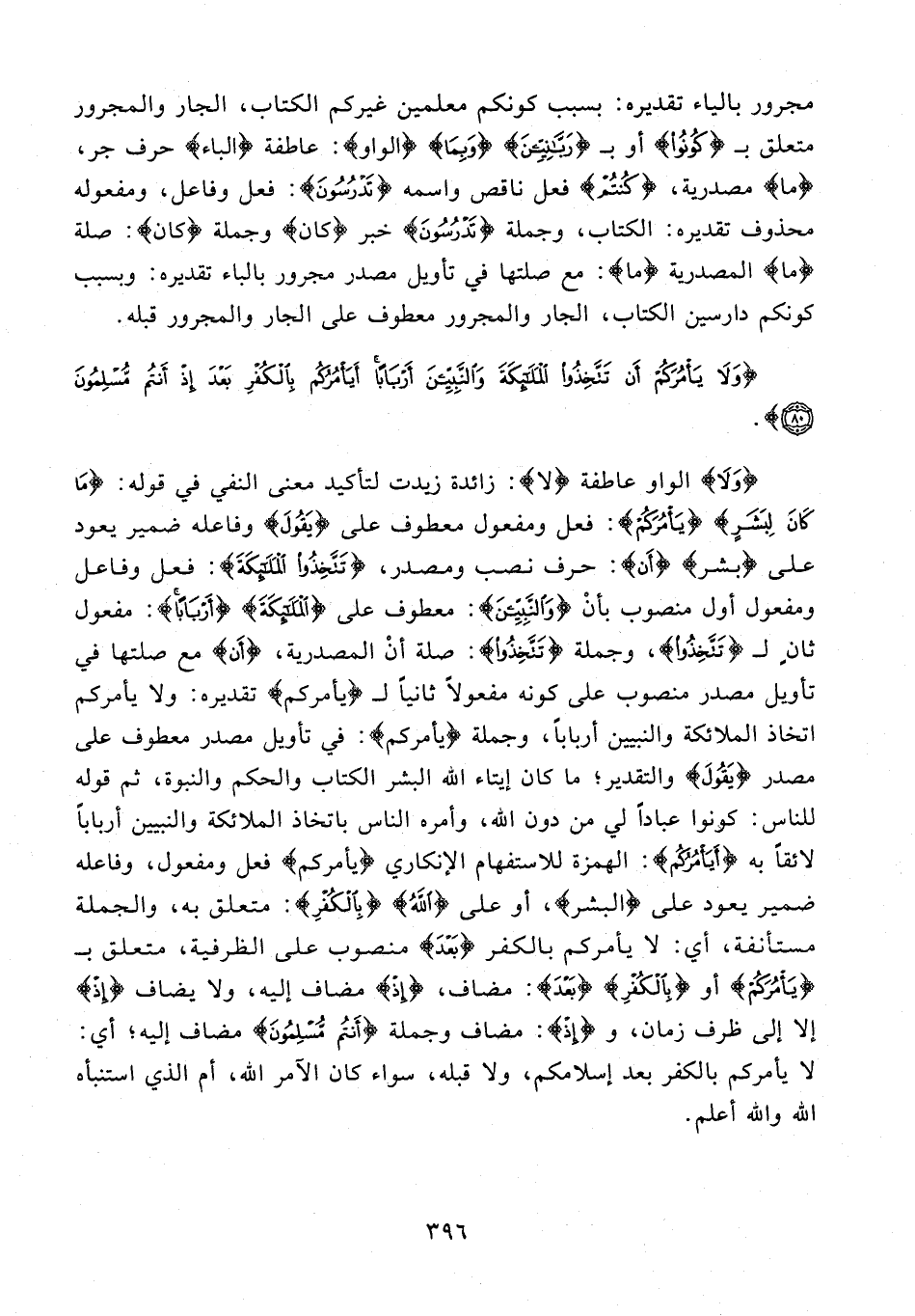 {وَلَا} الواو عاطفة {لا}: زائدة زيدت لتأكيد معنى النفي في قوله: {مَا كَانَ لِبَشَرٍ} {يَأْمُرَكُمْ}: فعل ومفعول معطوف على {يَقُولَ} وفاعله ضمير يعود على {بشر} {أَن}: حرف نصب ومصدر، {تَتَّخِذُوا الْمَلَائِكَةَ}: فعل وفاعل ومفعول أول منصوب بأنْ {وَالنَّبِيِّينَ}: معطوف على {الْمَلَائِكَةَ} {أَرْبَابًا}: مفعول ثانٍ لـ {تَتَّخِذُوا}، وجملة {تَتَّخِذُوا}: صلة أنْ المصدرية، {أَن} مع صلتها في تأويل مصدر منصوب على كونه مفعولًا ثانيًا لـ {يأمركم} تقديره: ولا يأمركم اتخاذ الملائكة والنبيين أربابًا، وجملة {يأمركم}: في تأويل مصدر معطوف على مصدر {يَقُولَ} والتقدير؛ ما كان إيتاء الله البشر الكتاب والحكم والنبوة، ثم قوله للناس: كونوا عبادًا لي من دون الله، وأمره الناس باتخاذ الملائكة والنبيين أربابًا لائقًا به {أَيَأْمُرُكُمْ}: الهمزة للاستفهام الإنكاري {يأمركم} فعل ومفعول، وفاعله ضمير يعود على {البشر}، أو على {اللَّهِ} {بِالْكُفْرِ}: متعلق به، والجملة مستأنفة، أي: لا يأمركم بالكفر {بَعْدَ} منصوب على الظرفية، متعلق بـ {يَأْمُرَكُمْ} أو {باَلْكُفْرِ} {بَعْدَ}: مضاف، {إذْ} مضاف إليه، ولا يضاف {إذْ} إلا إلى ظرف زمان، و {إذْ}: مضاف وجملة {أَنْتُمْ مُسْلِمُونَ} مضاف إليه؛ أي: لا يأمركم بالكفر بعد إسلامكم، ولا قبله، سواء كان الآمر الله، أم الذي استنبأه الله والله أعلم.