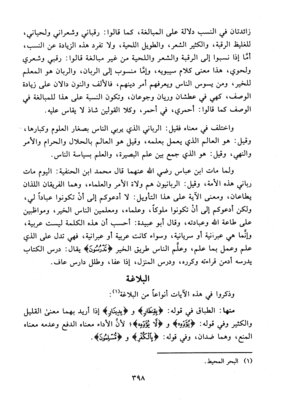 واختلف في معناه فقيل: الرباني الذي يربي الناس بصغار العلوم وكبارها، وقيل: هو العالم الذي يعمل بعلمه، وقيل هو العالم بالحلال والحرام والأمر والنهي، وقيل: هو الذي جمع بين علم البصيرة، والعلم بسياسة الناس.
