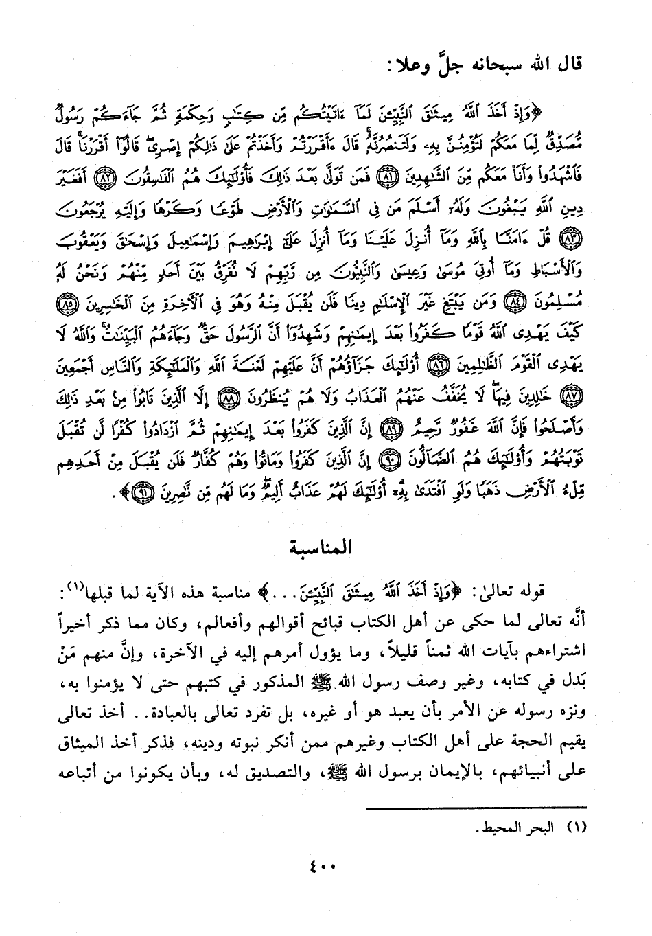 {وَإِذْ أَخَذَ اللَّهُ مِيثَاقَ النَّبِيِّينَ لَمَا آتَيْتُكُمْ مِنْ كِتَابٍ وَحِكْمَةٍ ثُمَّ جَاءَكُمْ رَسُولٌ مُصَدِّقٌ لِمَا مَعَكُمْ لَتُؤْمِنُنَّ بِهِ وَلَتَنْصُرُنَّهُ قَالَ أَأَقْرَرْتُمْ وَأَخَذْتُمْ عَلَى ذَلِكُمْ إِصْرِي قَالُوا أَقْرَرْنَا قَالَ فَاشْهَدُوا وَأَنَا مَعَكُمْ مِنَ الشَّاهِدِينَ (81) فَمَنْ تَوَلَّى بَعْدَ ذَلِكَ فَأُولَئِكَ هُمُ الْفَاسِقُونَ (82) أَفَغَيْرَ دِينِ اللَّهِ يَبْغُونَ وَلَهُ أَسْلَمَ مَنْ فِي السَّمَاوَاتِ وَالْأَرْضِ طَوْعًا وَكَرْهًا وَإِلَيْهِ يُرْجَعُونَ (83) قُلْ آمَنَّا بِاللَّهِ وَمَا أُنْزِلَ عَلَيْنَا وَمَا أُنْزِلَ عَلَى إِبْرَاهِيمَ وَإِسْمَاعِيلَ وَإِسْحَاقَ وَيَعْقُوبَ وَالْأَسْبَاطِ وَمَا أُوتِيَ مُوسَى وَعِيسَى وَالنَّبِيُّونَ مِنْ رَبِّهِمْ لَا نُفَرِّقُ بَيْنَ أَحَدٍ مِنْهُمْ وَنَحْنُ لَهُ مُسْلِمُونَ (84) وَمَنْ يَبْتَغِ غَيْرَ الْإِسْلَامِ دِينًا فَلَنْ يُقْبَلَ مِنْهُ وَهُوَ فِي الْآخِرَةِ مِنَ الْخَاسِرِينَ (85) كَيْفَ يَهْدِي اللَّهُ قَوْمًا كَفَرُوا بَعْدَ إِيمَانِهِمْ وَشَهِدُوا أَنَّ الرَّسُولَ حَقٌّ وَجَاءَهُمُ الْبَيِّنَاتُ وَاللَّهُ لَا يَهْدِي الْقَوْمَ الظَّالِمِينَ (86) أُولَئِكَ جَزَاؤُهُمْ أَنَّ عَلَيْهِمْ لَعْنَةَ اللَّهِ وَالْمَلَائِكَةِ وَالنَّاسِ أَجْمَعِينَ (87) خَالِدِينَ فِيهَا لَا يُخَفَّفُ عَنْهُمُ الْعَذَابُ وَلَا هُمْ يُنْظَرُونَ (88) إِلَّا الَّذِينَ تَابُوا مِنْ بَعْدِ ذَلِكَ وَأَصْلَحُوا فَإِنَّ اللَّهَ غَفُورٌ رَحِيمٌ (89) إِنَّ الَّذِينَ كَفَرُوا بَعْدَ إِيمَانِهِمْ ثُمَّ ازْدَادُوا كُفْرًا لَنْ تُقْبَلَ تَوْبَتُهُمْ وَأُولَئِكَ هُمُ الضَّالُّونَ (90) إِنَّ الَّذِينَ كَفَرُوا وَمَاتُوا وَهُمْ كُفَّارٌ فَلَنْ يُقْبَلَ مِنْ أَحَدِهِمْ مِلْءُ الْأَرْضِ ذَهَبًا وَلَوِ افْتَدَى بِهِ أُولَئِكَ لَهُمْ عَذَابٌ أَلِيمٌ وَمَا لَهُمْ مِنْ نَاصِرِينَ (91)}.
