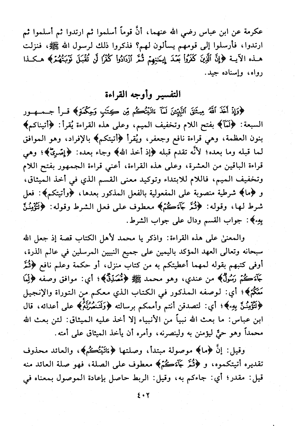 81 - {وَإِذْ أَخَذَ اللَّهُ مِيثَاقَ النَّبِيِّينَ لَمَا آتَيْتُكُمْ مِنْ كِتَابٍ وَحِكْمَةٍ} قرأ جمهور السبعة: {لَمَا} بفتح اللام وتخفيف الميم، وعلى هذه القراءة يُقرأ: {أتيناكم} بنون العظمة، وهي قراءة نافع وجعفر، ويُقرأ {أتيتكم} بالإفراد، وهو الموافق لما قبله وما بعده؛ لأنَّه تقدم قبله {إذ أخذ الله} وجاء بعده: {إصْرِي}؛ وهي قراءة الباقين من العشرة، وعلى هذه القراءة، أعني قراءة الجمهور بفتح اللام وتخفيف الميم، فاللام للابتداء وتوكيد معنى القسم الذي في أخذ الميثاق، و {ما} شرطية منصوبة على المفعولية بالفعل المذكور بعدها، {وأتيتكم}: فعل شرط لها، وقوله: {ثُمَّ جَاءَكُمْ} معطوف على فعل الشرط وقوله: {لَتُؤْمِنُنَّ بِهِ}: جواب القسم ودال على جواب الشرط.
