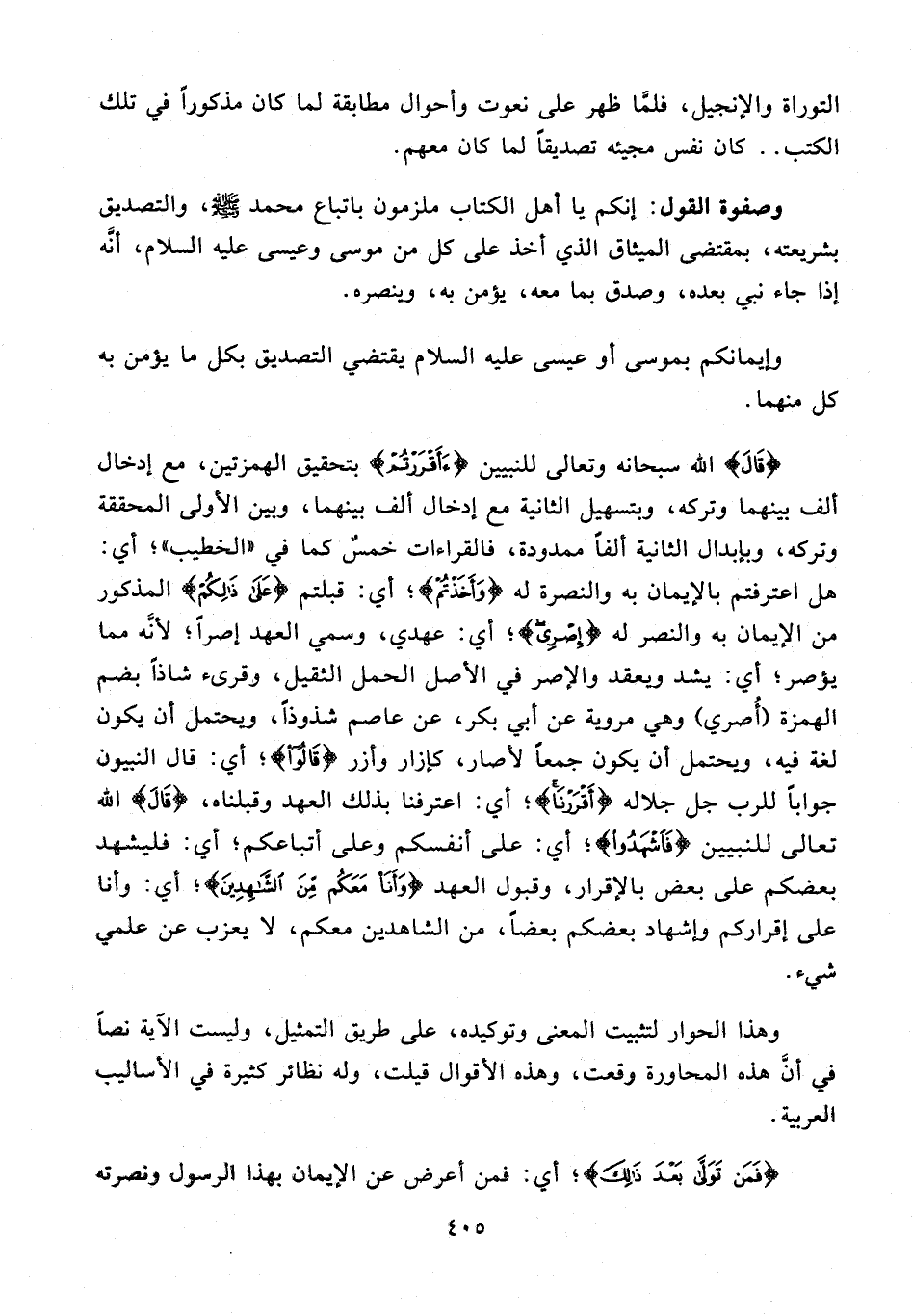 وصفوة القول: إنكم يا أهل الكتاب ملزمون باتباع محمَّد - صلى الله عليه وسلم -، والتصديق بشريعته، بمقتضى الميثاق الذي أخذ على كل من موسى وعيسى عليه السلام، أنَّه إذا جاء نبي بعده، وصدق بما معه، يؤمن به، وينصره.
