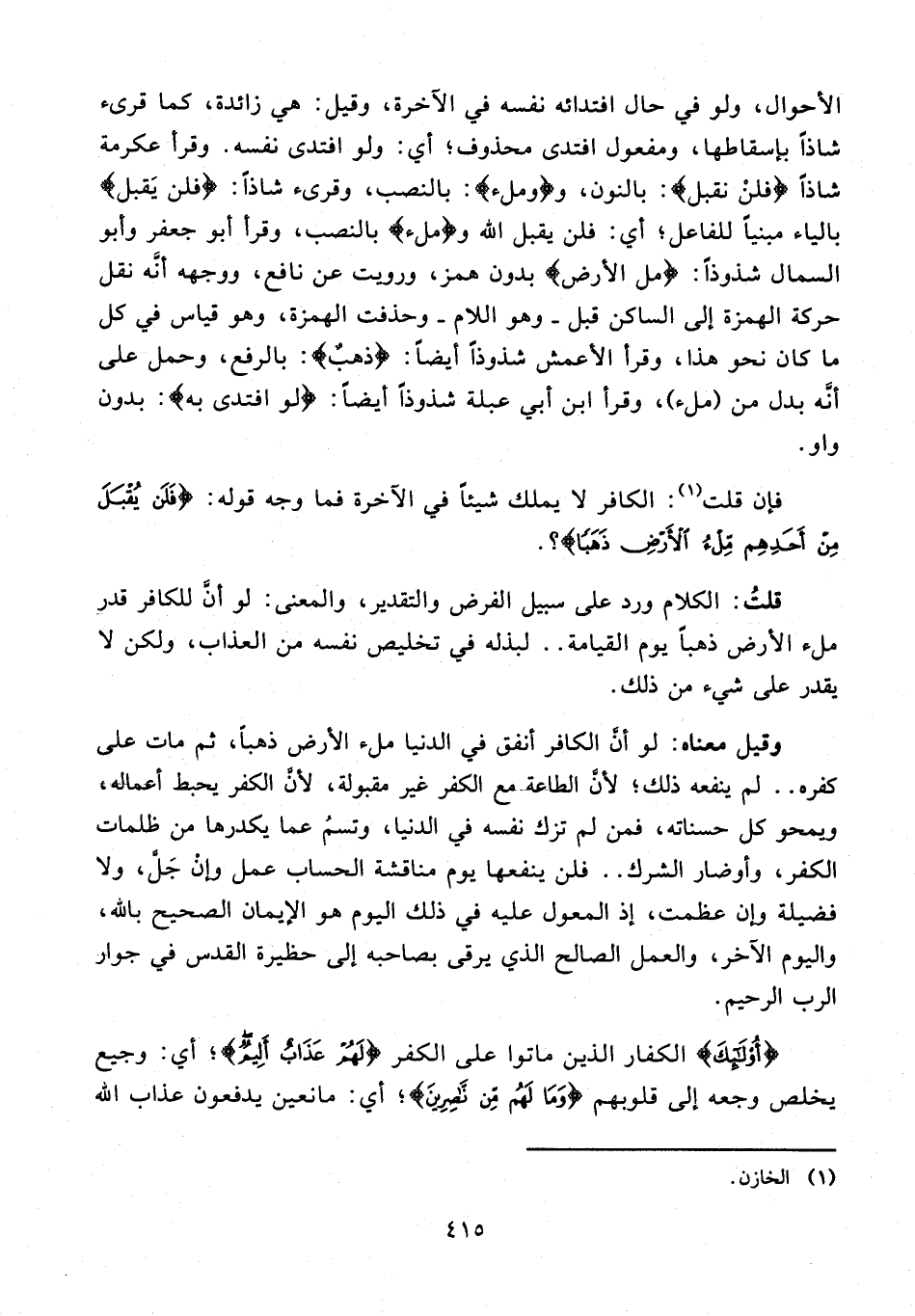 الأحوال، ولو في حال افتدائه نفسه في الآخرة، وقيل: هي زائدة، كما قرئ شاذًا بإسقاطها، ومفعول افتدى محذوف؛ أي: ولو افتدى نفسه. وقرأ عكرمة شاذًا {فلنْ نقبل}: بالنون، و {وملء}: بالنصب، وقرىء شاذًا: {فلن يَقبل} بالياء مبنيًّا للفاعل؛ أي: فلن يقبل الله و {ملء} بالنصب، وقرأ أبو جعفر وأبو السمال شذوذًا: {مل الأرض} بدون همز، ورويت عن نافع، ووجهه أنَّه نقل حركة الهمزة إلى الساكن قبل - وهو اللام - وحذفت الهمزة، وهو قياس في كل ما كان نحو هذا، وقرأ الأعمش شذوذًا أيضًا: {ذهبٌ}: بالرفع، وحمل على أنَّه بدل من (ملء)، وقرأ ابن أبي عبلة شذوذًا أيضًا: {لو افتدى به}: بدون واو.