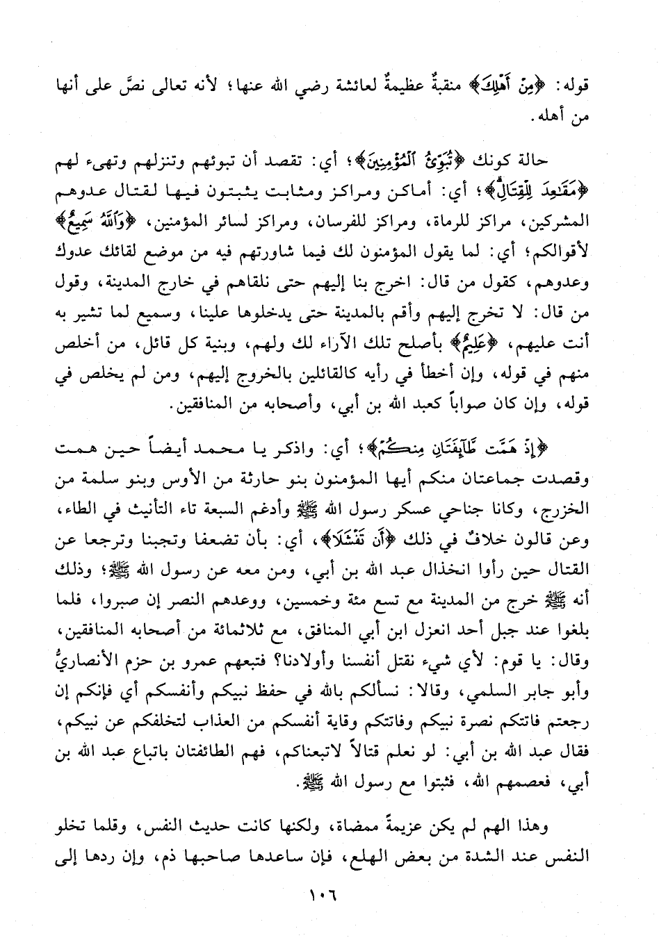 122 - {إِذْ هَمَّتْ طَائِفَتَانِ مِنْكُمْ}؛ أي: واذكر يا محمَّد أيضًا حين همت وقصدت جماعتان منكم أيها المؤمنون بنو حارثة من الأوس وبنو سلمة من الخزرج، وكانا جناحي عسكر رسول الله - صلى الله عليه وسلم - وأدغم السبعة تاء التأنيث في الطاء، وعن قالون خلافٌ في ذلك {أَنْ تَفْشَلَا}، أي: بأن تضعفا وتجبنا وترجعا عن القتال حين رأوا انخذال عبد الله بن أبي، ومن معه عن رسول الله - صلى الله عليه وسلم -؛ وذلك أنه - صلى الله عليه وسلم - خرج من المدينة مع تسع مئة وخمسين، ووعدهم النصر إن صبروا، فلما بلغوا عند جبل أحد انعزل ابن أبي المنافق، مع ثلاثمائة من أصحابه المنافقين، وقال: يا قوم: لأي شيء نقتل أنفسنا وأولادنا؟ فتبعهم عمرو بن حزم الأنصاريُّ وأبو جابر السلمي، وقالا: نسألكم بالله في حفظ نبيكم وأنفسكم أي فإنكم إن رجعتم فاتتكم نصرة نبيكم وفاتتكم وقاية أنفسكم من العذاب لتخلفكم عن نبيكم، فقال عبد الله بن أبي: لو نعلم قتالًا لاتبعناكم، فهم الطائفتان باتباع عبد الله بن أبي، فعصمهم الله، فثبتوا مع رسول الله - صلى الله عليه وسلم -.