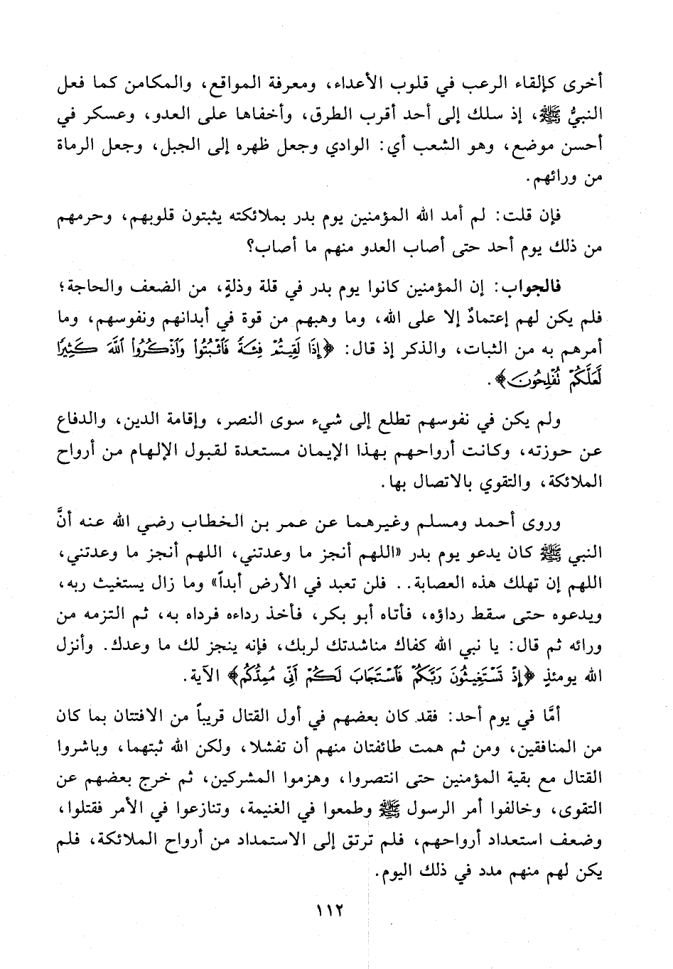 وروى أحمد ومسلم وغيرهما عن عمر بن الخطاب رضي الله عنه أنَّ النبي - صلى الله عليه وسلم - كان يدعو يوم بدر "اللهم أنجز ما وعدتني، اللهم أنجز ما وعدتني، اللهم إن تهلك هذه العصابة .. فلن تعبد في الأرض أبدًا" وما زال يستغيث ربه، ويدعوه حتى سقط رداؤه، فأتاه أبو بكر، فأخذ رداءه فرداه به، ثم التزمه من ورائه ثم قال: يا نبي الله كفاك مناشدتك لربك، فإنه ينجز لك ما وعدك. وأنزل الله يومئذٍ {إِذْ تَسْتَغِيثُونَ رَبَّكُمْ فَاسْتَجَابَ لَكُمْ أَنِّي مُمِدُّكُمْ} الآية.