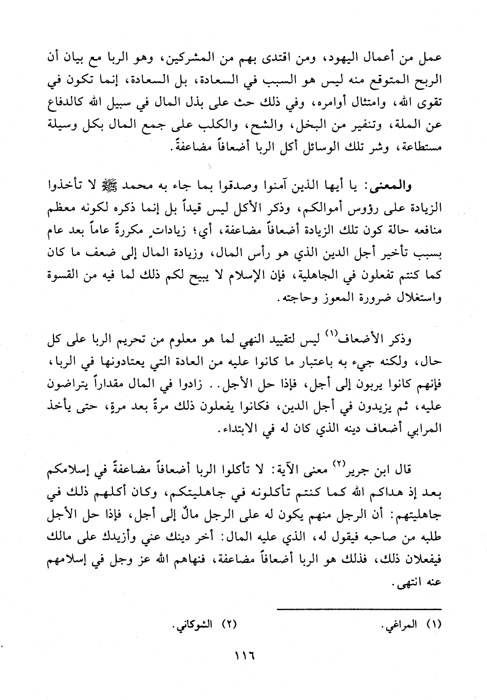 عمل من أعمال اليهود، ومن اقتدى بهم من المشركين، وهو الربا مع بيان أن الربح المتوقع منه ليس هو السبب في السعادة، بل السعادة، إنما تكون في تقوى الله، وامتثال أوامره، وفي ذلك حث على بذل المال في سبيل الله كالدفاع عن الملة، وتنفير من البخل، والشح، والكلب على جمع المال بكل وسيلة مستطاعة، وشر تلك الوسائل أكل الربا أضعافًا مضاعفة.
