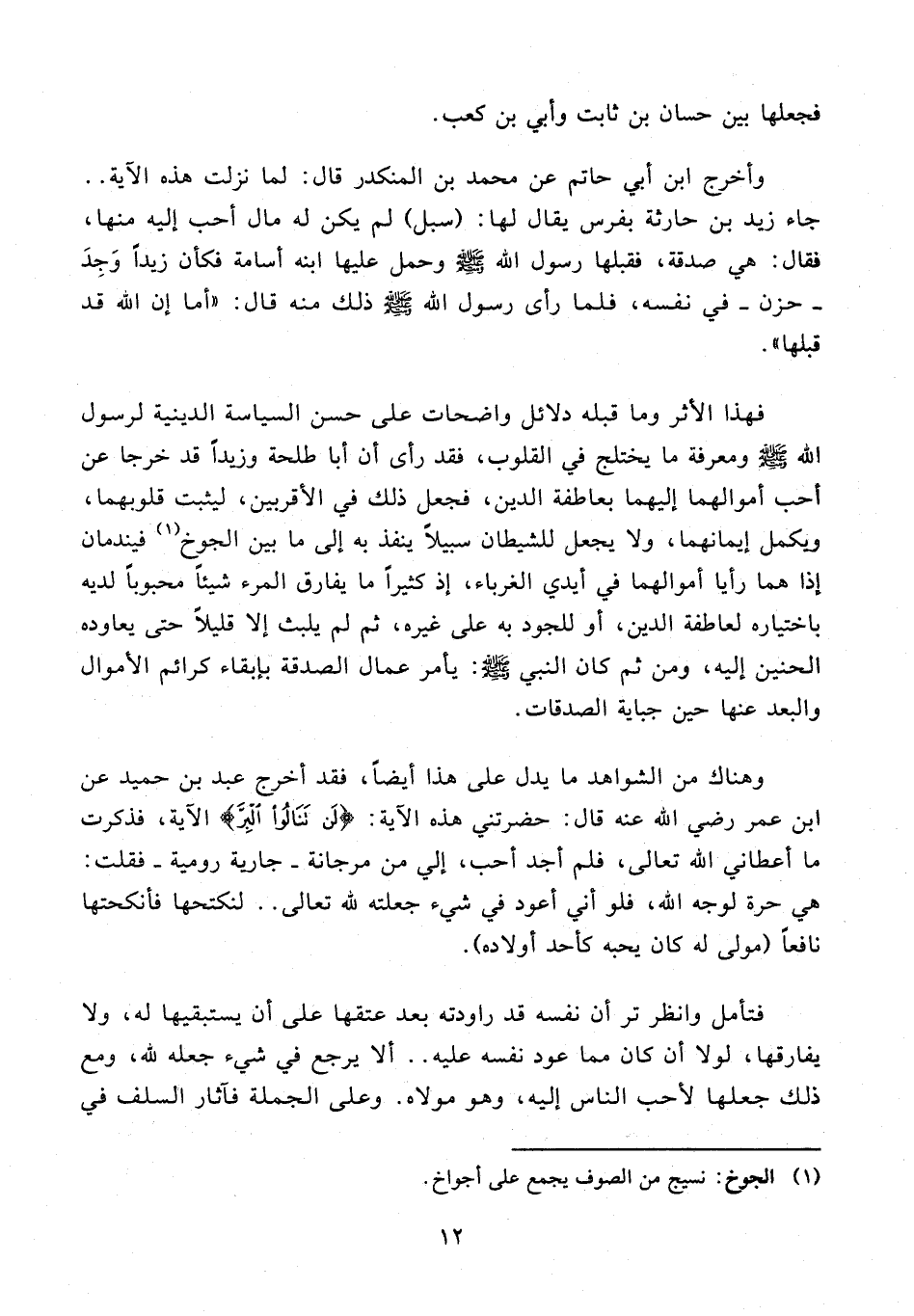 فهذا الأثر وما قبله دلائل واضحات على حسن السياسة الدينية لرسول الله - صلى الله عليه وسلم - ومعرفة ما يختلج في القلوب، فقد رأى أن أبا طلحة وزيدًا قد خرجا عن أحب أموالهما إليهما بعاطفة الدين، فجعل ذلك في الأقربين، ليثبت قلوبهما، ويكمل إيمانهما، ولا يجعل للشيطان سبيلًا ينفذ به إلى ما بين الجوخ (¬1) فيندمان إذا هما رأيا أموالهما في أيدى الغرباء، إذ كثيرًا ما يفارق المرء شيئًا محبوبًا لديه باختياره لعاطفة الدين، أو للجود به على غيره، ثم لم يلبث إلا قليلًا حتى يعاوده الحنين إليه، ومن ثم كان النبي - صلى الله عليه وسلم -: يأمر عمال الصدقة بإبقاء كرائم الأموال والبعد عنها حين جباية الصدقات.