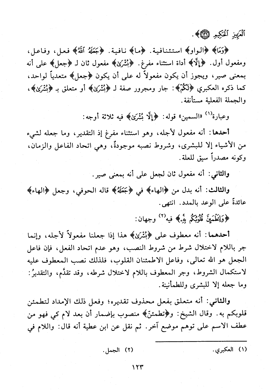 {وَمَا} {الواو} استئنافية. {ما} نافية. {جَعَلَهُ اللَّهُ} فعل، وفاعل، ومفعول أول. {إِلَّا} أداة استثناء مفرغ. {بُشْرَى} مفعول ثان لـ {جَعَلَ} على أنه بمعنى صير، ويجوز أن يكون مفعولًا له على أن يكون {جَعَلَ} متعديًّا لواحد، كما ذكره العكبري {لَكُمْ}: جار ومجرور صفة لـ {بُشْرَى} أو متعلق بـ {بُشْرَى}، والجملة الفعلية مستأنفة.