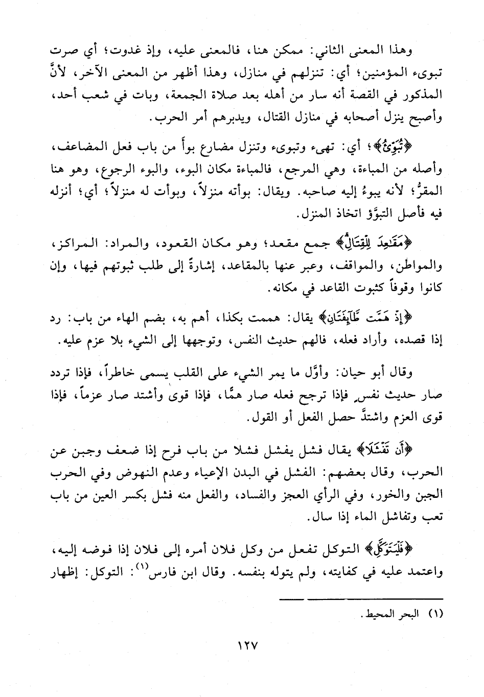 {أَنْ تَفْشَلَا} يقال فشل يفشل فشلا من باب فرح إذا ضعف وجبن عن الحرب، وقال بعضهم: الفشل في البدن الإعياء وعدم النهوض وفي الحرب الجبن والخور، وفي الرأي العجز والفساد، والفعل منه فشل بكسر العين من باب تعب وتفاشل الماء إذا سأل.