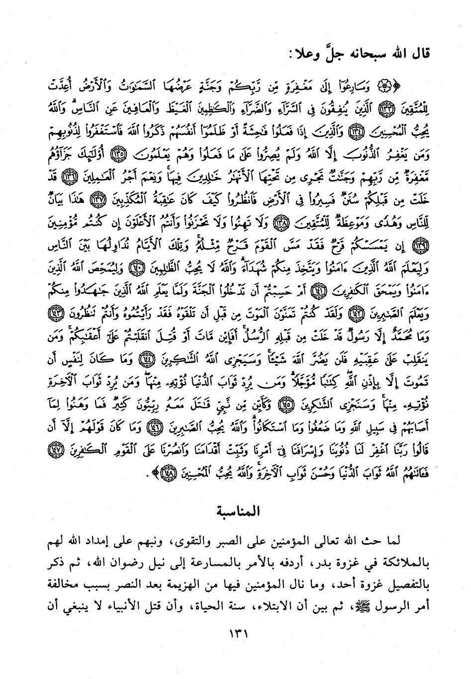 {وَسَارِعُوا إِلَى مَغْفِرَةٍ مِنْ رَبِّكُمْ وَجَنَّةٍ عَرْضُهَا السَّمَاوَاتُ وَالْأَرْضُ أُعِدَّتْ لِلْمُتَّقِينَ (133) الَّذِينَ يُنْفِقُونَ فِي السَّرَّاءِ وَالضَّرَّاءِ وَالْكَاظِمِينَ الْغَيْظَ وَالْعَافِينَ عَنِ النَّاسِ وَاللَّهُ يُحِبُّ الْمُحْسِنِينَ (134) وَالَّذِينَ إِذَا فَعَلُوا فَاحِشَةً أَوْ ظَلَمُوا أَنْفُسَهُمْ ذَكَرُوا اللَّهَ فَاسْتَغْفَرُوا لِذُنُوبِهِمْ وَمَنْ يَغْفِرُ الذُّنُوبَ إِلَّا اللَّهُ وَلَمْ يُصِرُّوا عَلَى مَا فَعَلُوا وَهُمْ يَعْلَمُونَ (135) أُولَئِكَ جَزَاؤُهُمْ مَغْفِرَةٌ مِنْ رَبِّهِمْ وَجَنَّاتٌ تَجْرِي مِنْ تَحْتِهَا الْأَنْهَارُ خَالِدِينَ فِيهَا وَنِعْمَ أَجْرُ الْعَامِلِينَ (136) قَدْ خَلَتْ مِنْ قَبْلِكُمْ سُنَنٌ فَسِيرُوا فِي الْأَرْضِ فَانْظُرُوا كَيْفَ كَانَ عَاقِبَةُ الْمُكَذِّبِينَ (137) هَذَا بَيَانٌ لِلنَّاسِ وَهُدًى وَمَوْعِظَةٌ لِلْمُتَّقِينَ (138) وَلَا تَهِنُوا وَلَا تَحْزَنُوا وَأَنْتُمُ الْأَعْلَوْنَ إِنْ كُنْتُمْ مُؤْمِنِينَ (139) إِنْ يَمْسَسْكُمْ قَرْحٌ فَقَدْ مَسَّ الْقَوْمَ قَرْحٌ مِثْلُهُ وَتِلْكَ الْأَيَّامُ نُدَاوِلُهَا بَيْنَ النَّاسِ وَلِيَعْلَمَ اللَّهُ الَّذِينَ آمَنُوا وَيَتَّخِذَ مِنْكُمْ شُهَدَاءَ وَاللَّهُ لَا يُحِبُّ الظَّالِمِينَ (140) وَلِيُمَحِّصَ اللَّهُ الَّذِينَ آمَنُوا وَيَمْحَقَ الْكَافِرِينَ (141) أَمْ حَسِبْتُمْ أَنْ تَدْخُلُوا الْجَنَّةَ وَلَمَّا يَعْلَمِ اللَّهُ الَّذِينَ جَاهَدُوا مِنْكُمْ وَيَعْلَمَ الصَّابِرِينَ (142) وَلَقَدْ كُنْتُمْ تَمَنَّوْنَ الْمَوْتَ مِنْ قَبْلِ أَنْ تَلْقَوْهُ فَقَدْ رَأَيْتُمُوهُ وَأَنْتُمْ تَنْظُرُونَ (143) وَمَا مُحَمَّدٌ إِلَّا رَسُولٌ قَدْ خَلَتْ مِنْ قَبْلِهِ الرُّسُلُ أَفَإِنْ مَاتَ أَوْ قُتِلَ انْقَلَبْتُمْ عَلَى أَعْقَابِكُمْ وَمَنْ يَنْقَلِبْ عَلَى عَقِبَيْهِ فَلَنْ يَضُرَّ اللَّهَ شَيْئًا وَسَيَجْزِي اللَّهُ الشَّاكِرِينَ (144) وَمَا كَانَ لِنَفْسٍ أَنْ تَمُوتَ إِلَّا بِإِذْنِ اللَّهِ كِتَابًا مُؤَجَّلًا وَمَنْ يُرِدْ ثَوَابَ الدُّنْيَا نُؤْتِهِ مِنْهَا وَمَنْ يُرِدْ ثَوَابَ الْآخِرَةِ نُؤْتِهِ مِنْهَا وَسَنَجْزِي الشَّاكِرِينَ (145) وَكَأَيِّنْ مِنْ نَبِيٍّ قَاتَلَ مَعَهُ رِبِّيُّونَ كَثِيرٌ فَمَا وَهَنُوا لِمَا أَصَابَهُمْ فِي سَبِيلِ اللَّهِ وَمَا ضَعُفُوا وَمَا اسْتَكَانُوا وَاللَّهُ يُحِبُّ الصَّابِرِينَ (146) وَمَا كَانَ قَوْلَهُمْ إِلَّا أَنْ قَالُوا رَبَّنَا اغْفِرْ لَنَا ذُنُوبَنَا وَإِسْرَافَنَا فِي أَمْرِنَا وَثَبِّتْ أَقْدَامَنَا وَانْصُرْنَا عَلَى الْقَوْمِ الْكَافِرِينَ (147) فَآتَاهُمُ اللَّهُ ثَوَابَ الدُّنْيَا وَحُسْنَ ثَوَابِ الْآخِرَةِ وَاللَّهُ يُحِبُّ الْمُحْسِنِينَ (148)}.