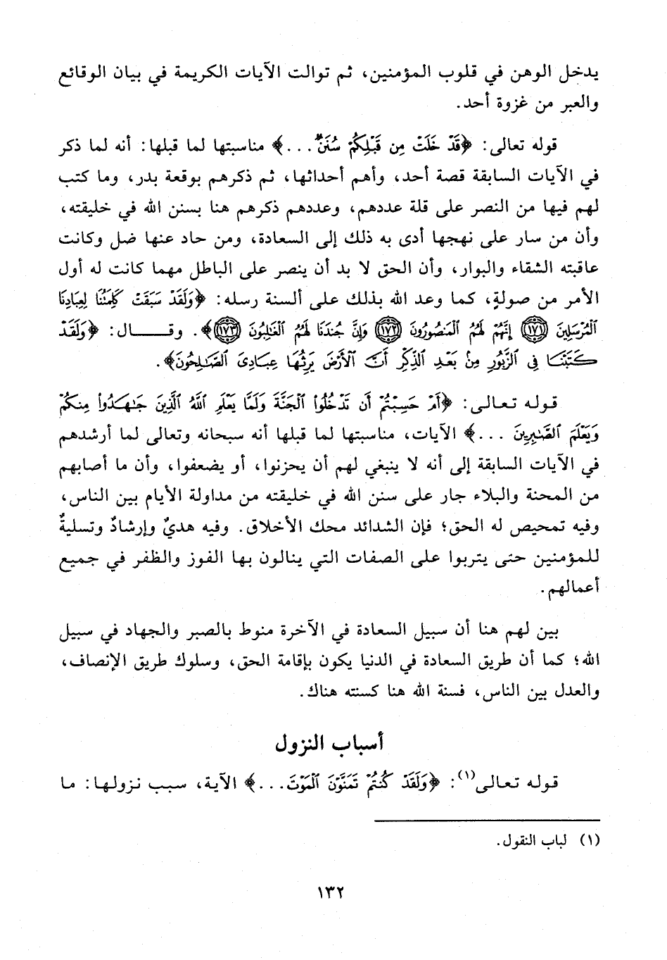 قوله تعالى: {أَمْ حَسِبْتُمْ أَنْ تَدْخُلُوا الْجَنَّةَ وَلَمَّا يَعْلَمِ اللَّهُ الَّذِينَ جَاهَدُوا مِنْكُمْ وَيَعْلَمَ الصَّابِرِينَ ...} الآيات، مناسبتها لما قبلها أنه سبحانه وتعالى لما أرشدهم في الآيات السابقة إلى أنه لا ينبغي لهم أن يحزنوا، أو يضعفوا، وأن ما أصابهم من المحنة والبلاء جار على سنن الله في خليقته من مداولة الأيام بين الناس، وفيه تمحيص له الحق؛ فإن الشدائد محك الأخلاق. وفيه هديٌ وإرشادٌ وتسليةٌ للمؤمنين حتى يتربوا على الصفات التي ينالون بها الفوز والظفر في جميع أعمالهم.