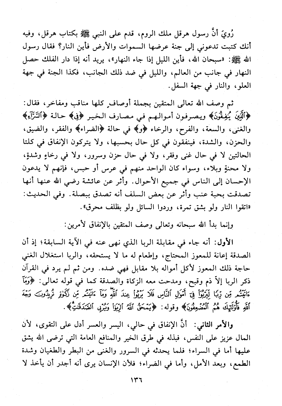 والأمر الثاني: أنَّ الإنفاق في حالي، اليسر والعسر أدل على التقوى, لأن المال عزيز على النفس، فبذله في طرق الخير والمنافع العامة التي ترضي الله يشق عليها أما في السراء؛ فلما يحدثه في السرور والغنى من البطر والطغيان وشدة الطمع، وبعد الأمل، وأما في الضراء؛ فلأن الإنسان يرى أنه أجدر أن يأخذ لا