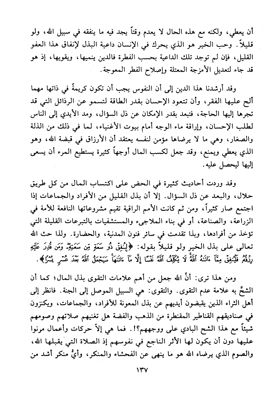 ومن هذا ترى: أنَّ الله جعل من أهم علامات التقوى بذل المال؛ كما أن الشحَّ به علامة عدم التقوى. والتقوى: هي السبيل الموصل إلى الجنة. فانظر إلى أهل الثراء الذين يقبضون أيديهم عن بذل المعونة للأفراد، والجماعات، ويكنزون في صناديقهم القناطير المقنطرة من الذهب والفضة هل تغنيهم صلاتهم وصومهم شيئًا مع هذا الشح البادي على ووجههم؟!. فما هي إلّا حركات وأعمال مرنوا عليها دون أن يكون لها الأثر الناجع في نفوسهم إذ الصلاة التي يقبلها الله، والصوم الذي يرضاه الله هو ما ينهى عن الفحشاء والمنكر، وأيُّ منكر أشد من