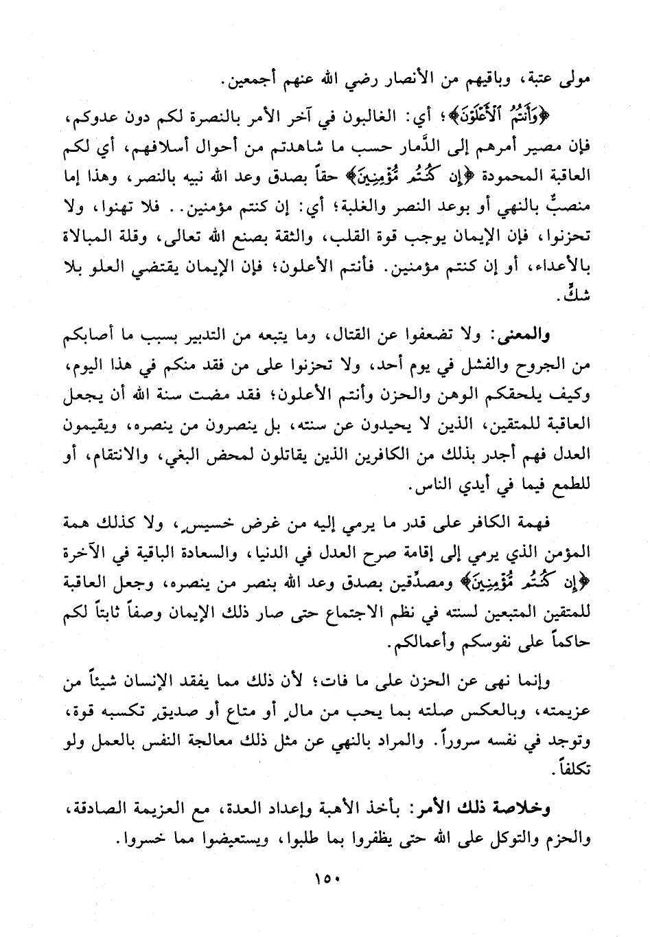 والمعنى: ولا تضعفوا عن القتال، وما يتبعه من التدبير بسبب ما أصابكم من الجروح والفشل في يوم أحد، ولا تحزنوا على من فقد منكم في هذا اليوم، وكيف يلحقكم الوهن والحزن وأنتم الأعلون؛ فقد مضت سنة الله أن يجعل العاقبة للمتقين، الذين لا يحيدون عن سنته، بل ينصرون من ينصره، ويقيمون العدل فهم أجدر بذلك من الكافرين الذين يقاتلون لمحض البغي، والانتقام، أو للطمع فيما في أيدي الناس.