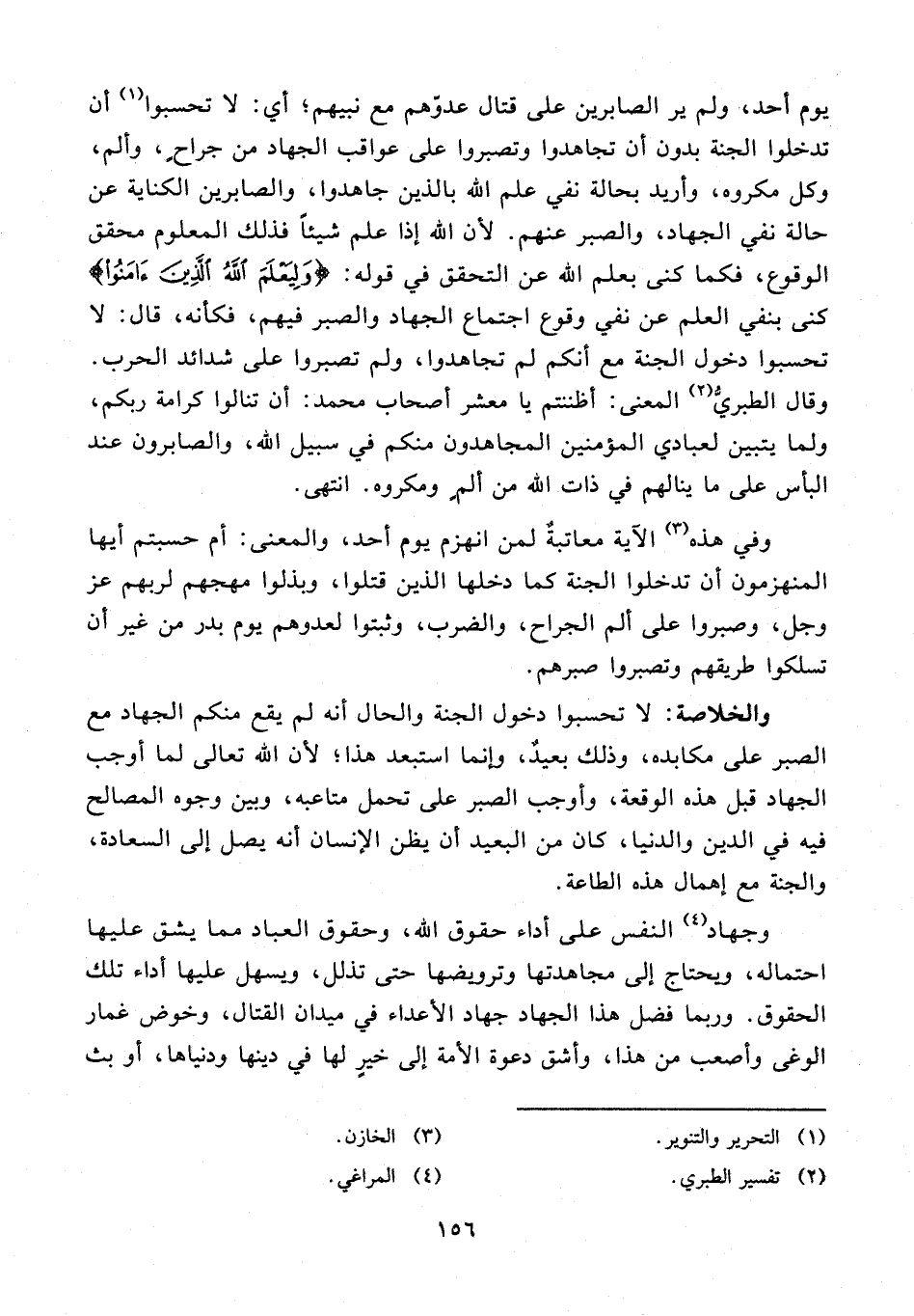 والخلاصة: لا تحسبوا دخول الجنة والحال أنه لم يقع منكم الجهاد مع الصبر على مكابده، وذلك بعيدٌ، وإنما استبعد هذا؛ لأن الله تعالى لما أوجب الجهاد قبل هذه الوقعة، وأوجب الصبر على تحمل متاعبه، وبين وجوه المصالح فيه في الدين والدنيا، كان عن البعيد أن يظن الإنسان أنه يصل إلى السعادة، والجنة مع إهمال هذه الطاعة.